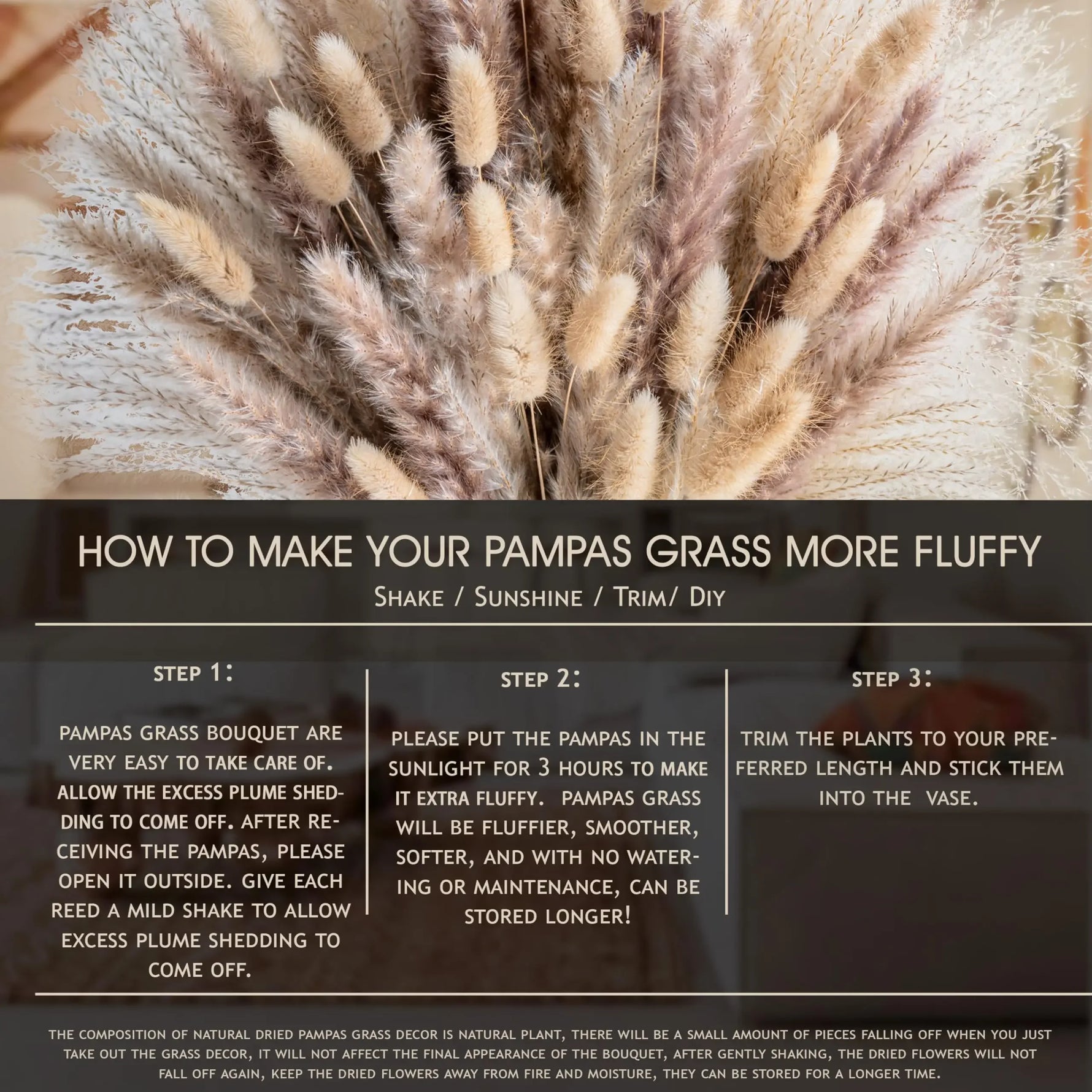 BEFORE USE - After opening your pampas grass package, please put it under the sun for 2-3 hours and shake slightly 1-2 times. After opening package, 2-3 days later leafs will be fluffy. After that you can use this beatiful natural dried pampas graass as decor or gift.