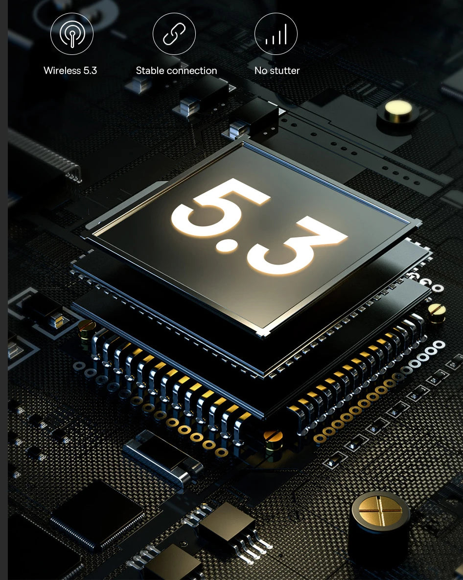 New Wireless V5.3 chips bring high quality sound and stable and high-speed transmission over a distance of 10meters for clear and low latency calls and audio-to-video synchronization,without music or video stutter