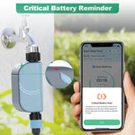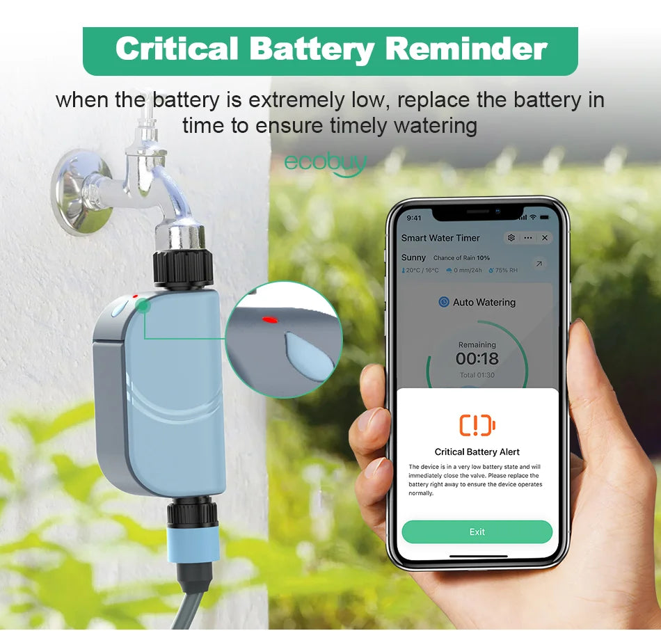 Low battery reminder, all functions can still be used normally to prevent watering interruption; when the battery is extremely low, replace the battery in time to ensure timely watering