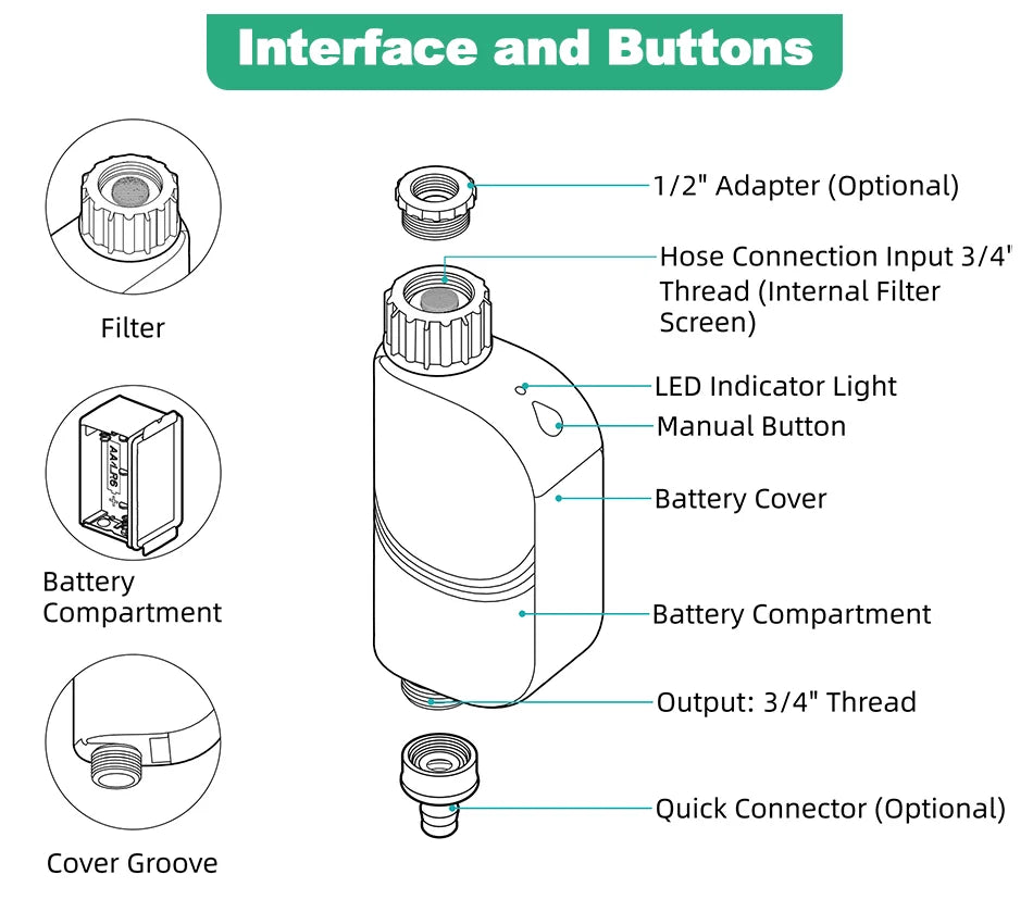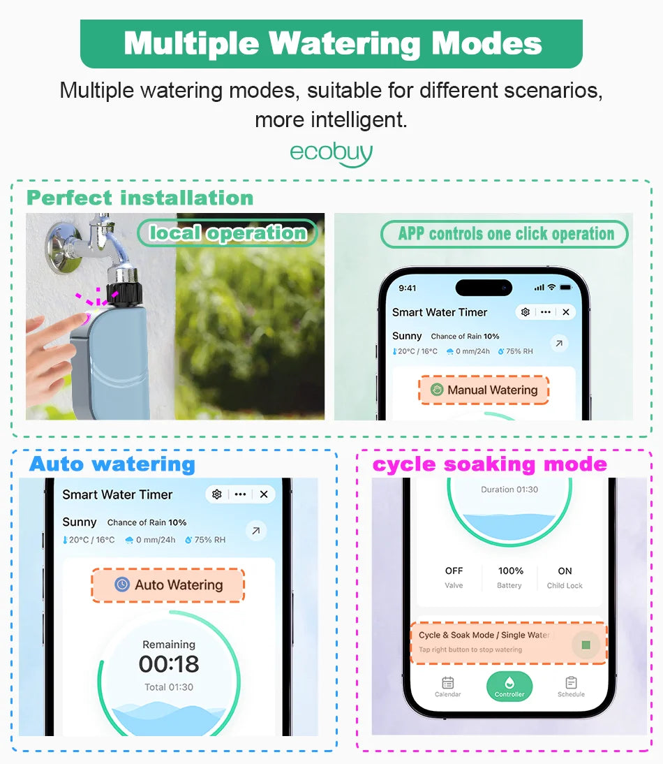 The device supports the local button on the device to quickly start watering for 10 minutes. The APP can also operate the manual mode watering. In the automatic mode, it will run according to the schedule you set before. The cycle soaking mode can break down the plan into multiple cycles of watering to give the soil enough time to absorb