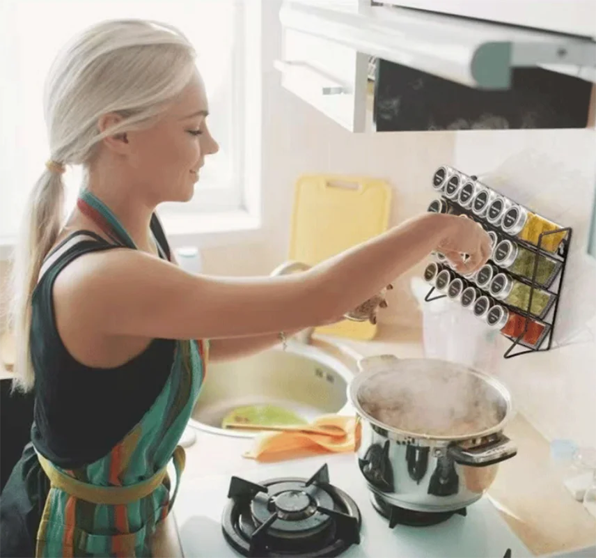 Description: Kitchen cabinet organizer, wall mounted spice rack, shelves.