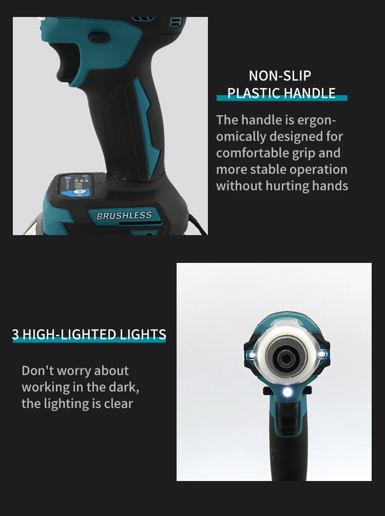 1.Powerful Motor & High Torque: Maximum torque of 180N.M, along with variable speed up to3600RPM, this impact driver can drive screws or tighten nuts at astonishing speed.