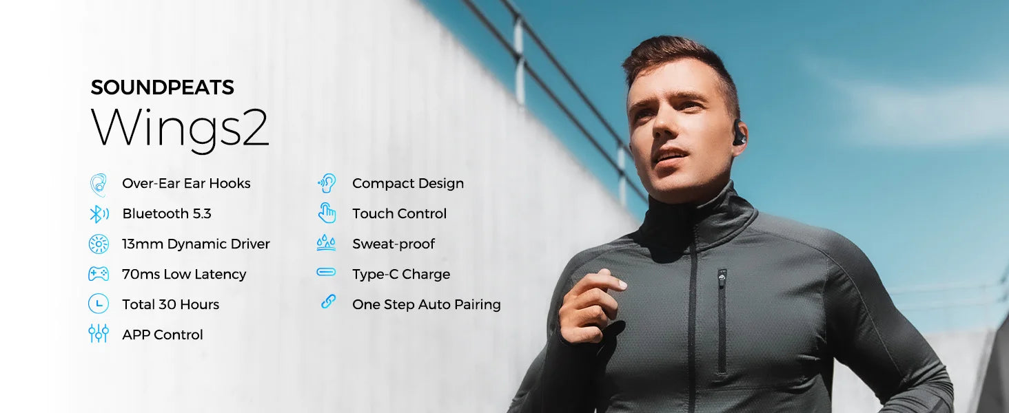 Up to 8 hours of playing time on one single charge. The charging case can recharge SoundPEATS Wings2 over-ear sports earbuds 2.8 times for a total of up to 30 hours of listening time. You can enjoy uninterrupted music with the Wings2 headphones during your workouts.