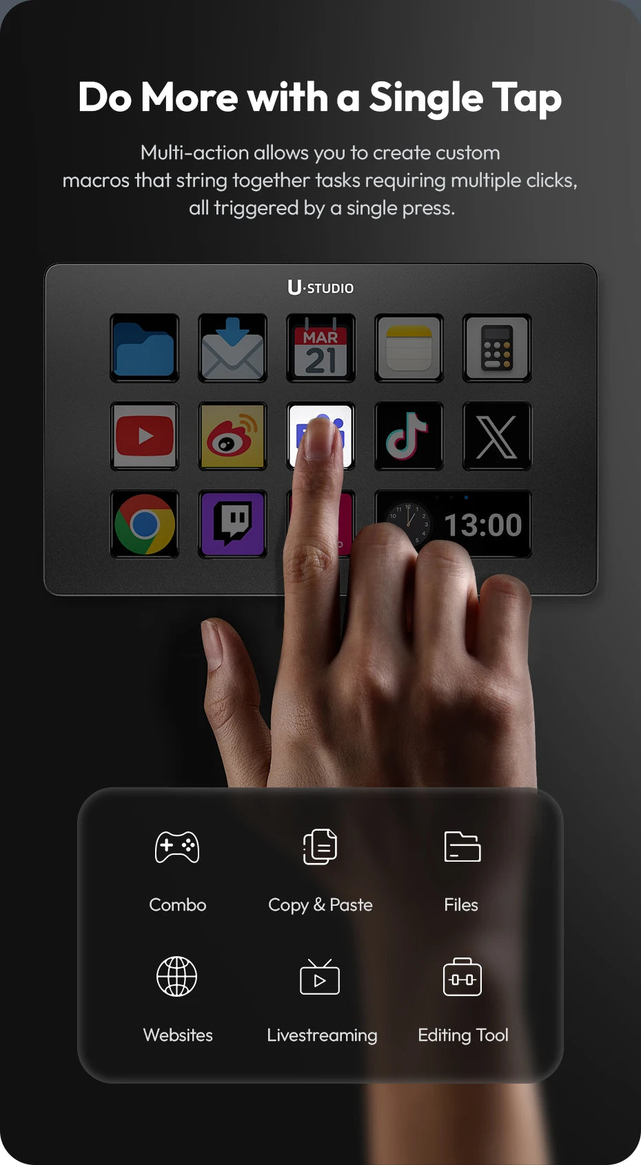 Gaming: Assign key combos, manage character actions, or communicate in-game-all with one touch.