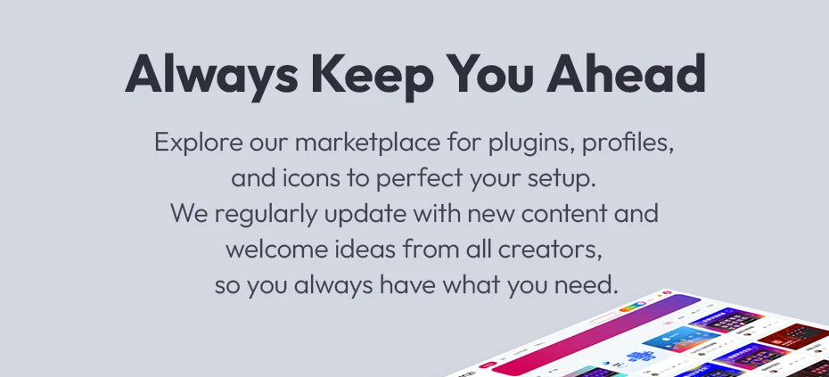 Explore our marketplace for plugins, profiles, and icons to perfect your setup. We regularly update with new content and welcome ideas from all creators, so you always have what you need.