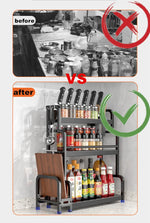 Sturdy Construction: The kitchen countertop organizer is made of heavy-duty steel material with powder coating, durable and easy to clean. The square legs of seasoning rack are thicker and enough strong to load up to 35lb