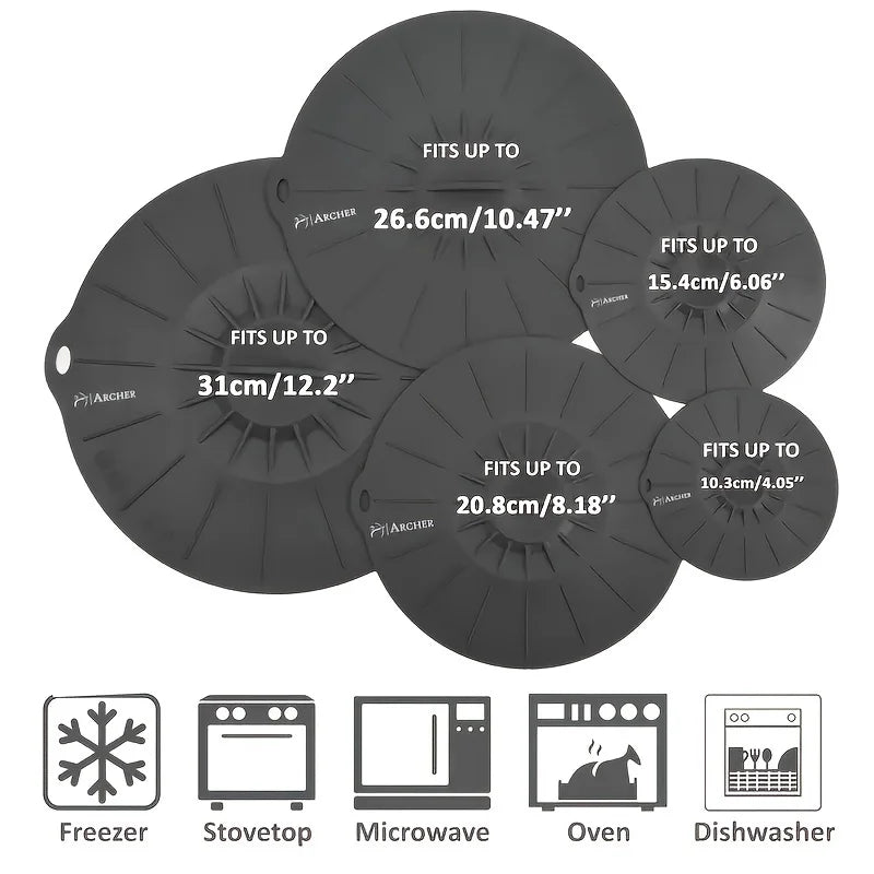 【MULTIPURPOSE VERSATILITY】Totally 5 Sizes- 4 inch, 6 inch, 8 inch, 10 inch and extra large 11.7nch. The sizes in between vary and they will fit almost anything!! Such as Pot, Pan, Dish, Plate,Bowls,Container,Coffee Cup Jar,Can and more. Great for Cooking and Baking .Also Perfectly and Safely use for Microwave, StoveTop, Oven, Fridge and Freezer Safe. Withstands temperatures from -104 degrees F to 450 degrees F.