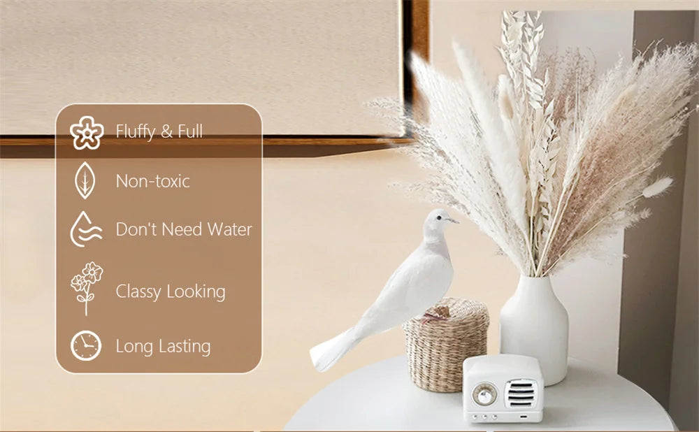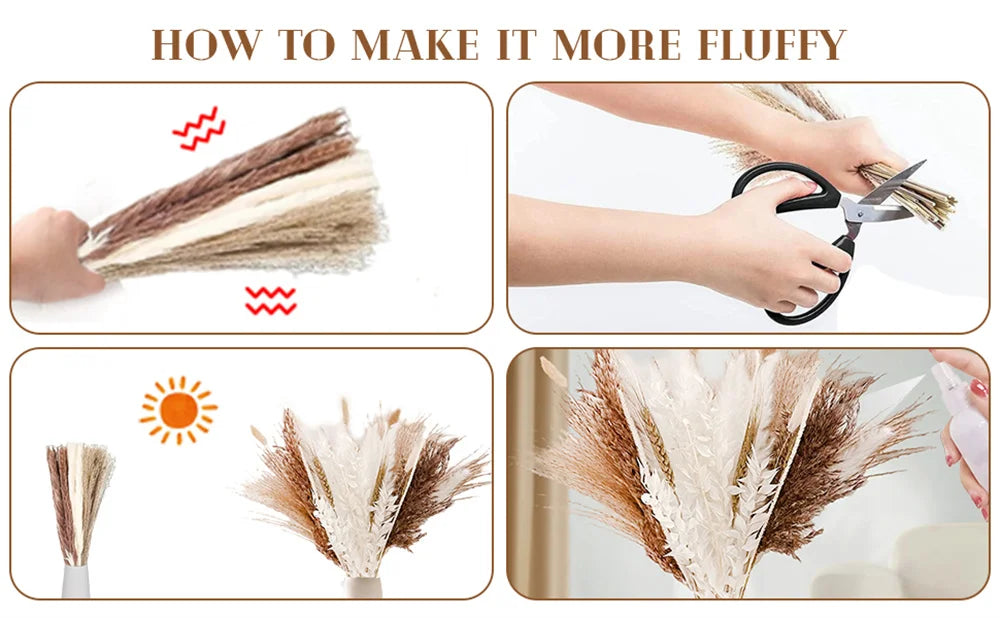 【Warm Tips】:The pampas grass bouquet gets squeezed during long journey from farm to your home. Before use, please leave the pampas grass under the sun for a few hours to fluff it up or use hair dryer at low heat to gently blow it. Because it is a pure natural plant, so there is a normal shedding phenomenon.Once placed in a vase, the amount of shedding will be minimal.