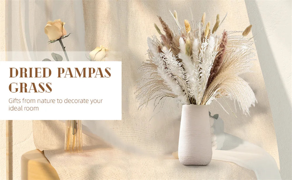 【Natural Dried Pampas Grass】: The pampas grass dried flowers are made of 100% natural high-quality reed grass, each one has been carefully selected, durable, never fade, Also, dried pompous grass doesn’t release pollen or odors, so if anyone in your house has strong allergies, you don’t have to worry. And you don’t need to water pampass grass, either.