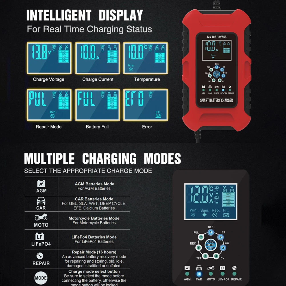 7-stage charging device is suitable for most battery types of l ead batteries including Calcium, G el, A GM, LiFePo4, Wet, l ead Acid, etc.