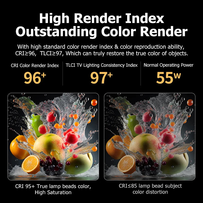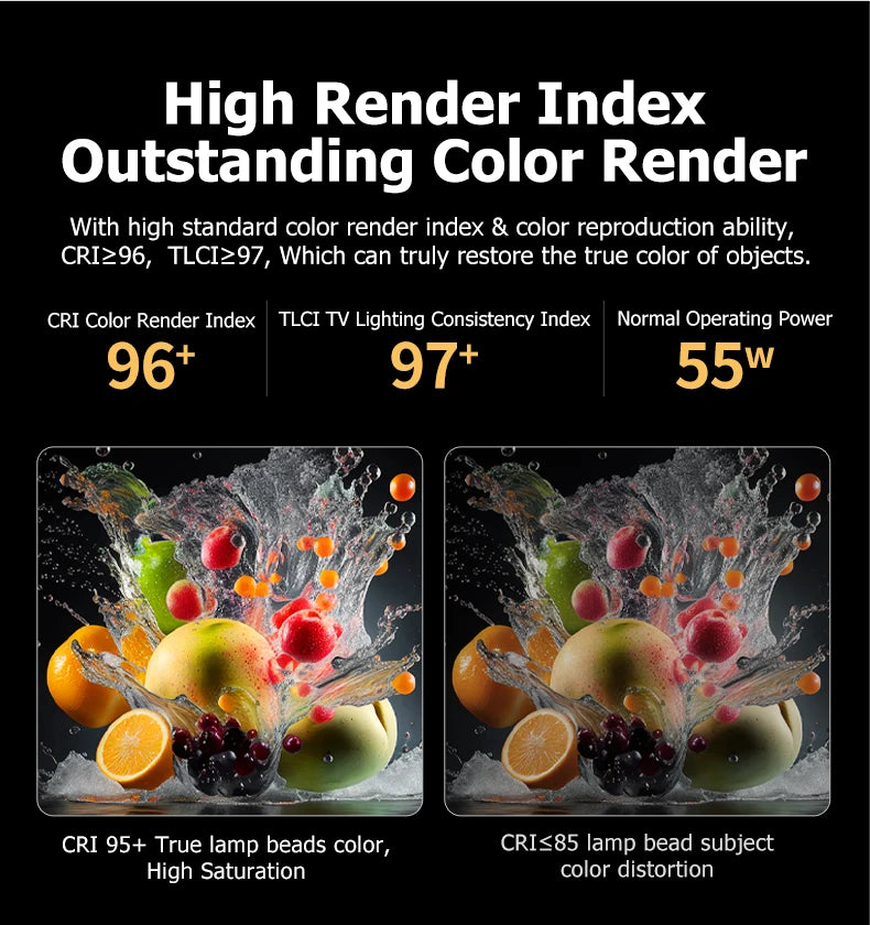 The CCT color temperature range of 3200K-5600K ±200K allows for precise adjustments to match any lighting environment, while the high CRI of 96 and TLCI of 97 ensure exceptional color accuracy and fidelity, making it perfect for film, photography, and other applications where color rendering is critical.