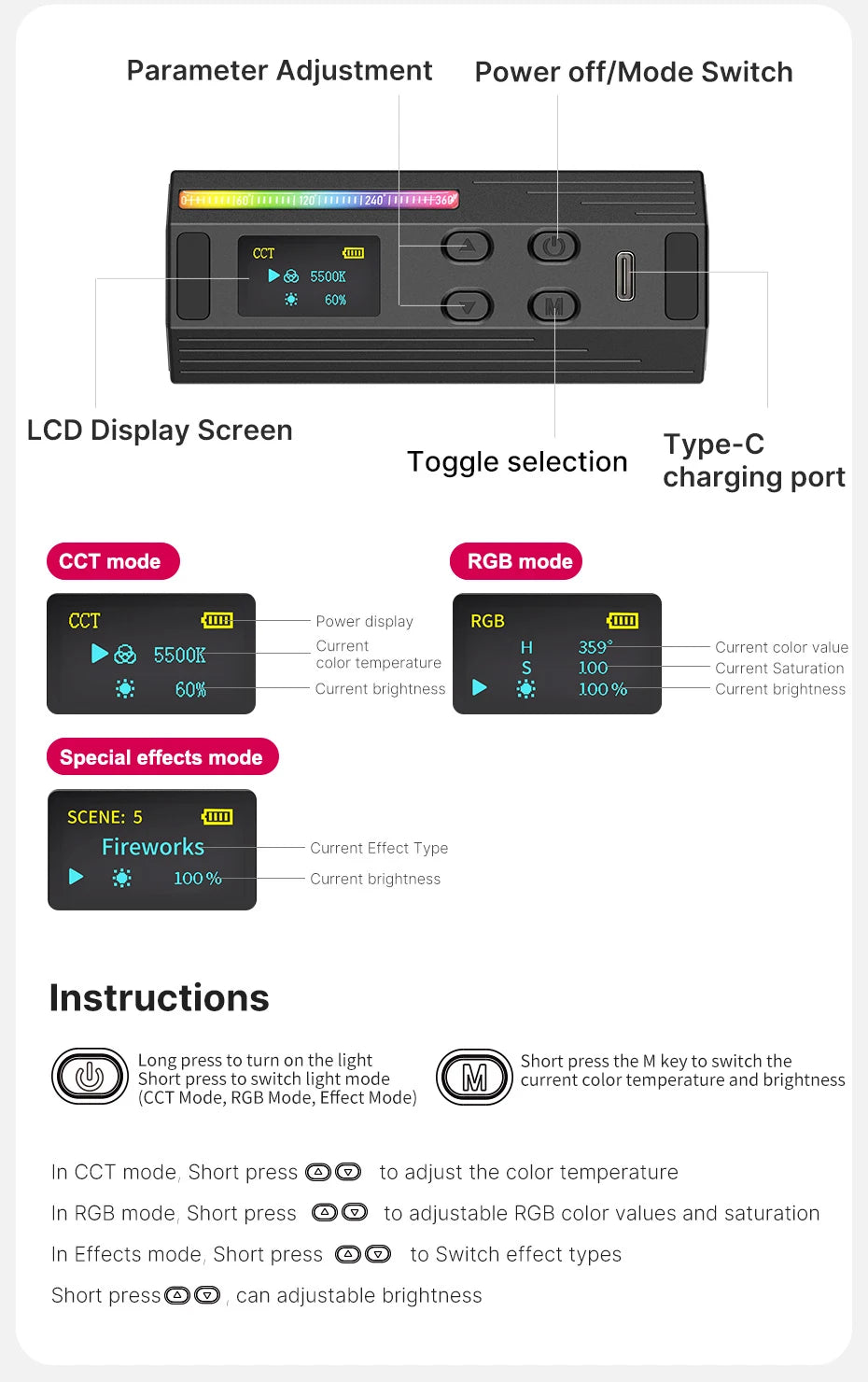 LED video light equips with LCD display for accurate readings, aiming to reach visualization of parameter adjustment.