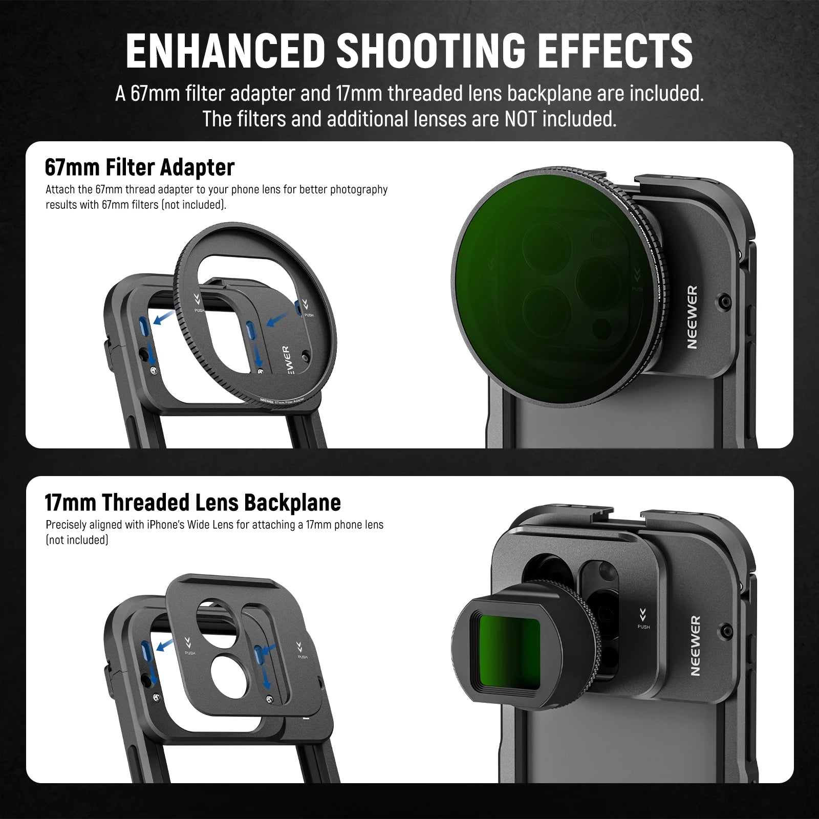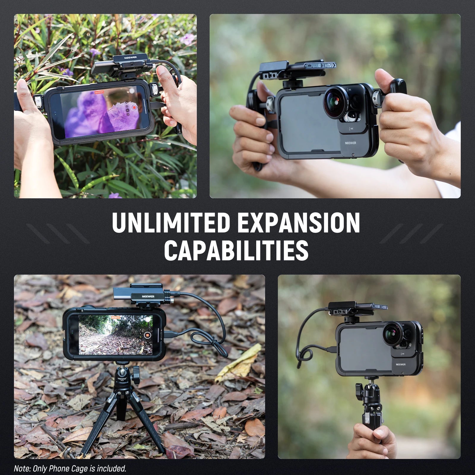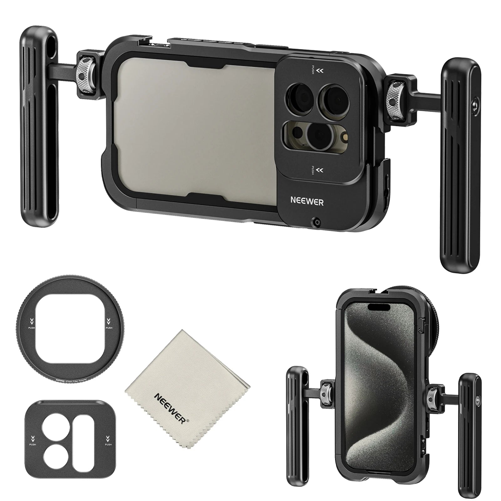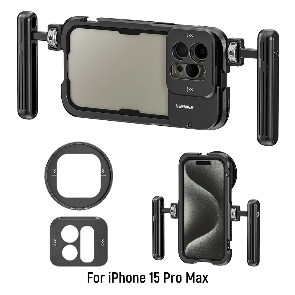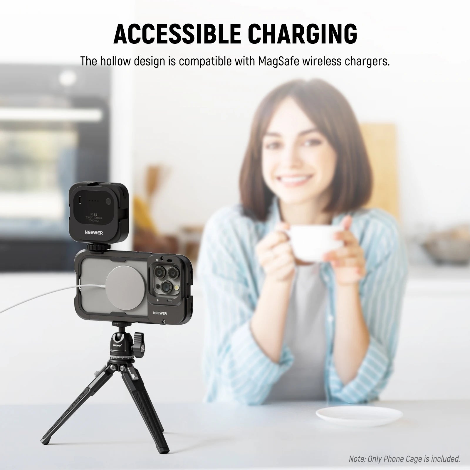 【Compatible with iPhone 15 Pro/pro max】 Only compatible with iPhone 15 Pro/pro max, this CNC machined aluminum alloy phone cage features dual side handles for stable handheld video shooting and a soft rubber cushion for reliable protection where you go. The hollow back is compatible with MagSafe wireless charger and NEEWER PA010 Magnetic Phone Holder. Note: Not compatible with MagSafe battery pack