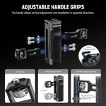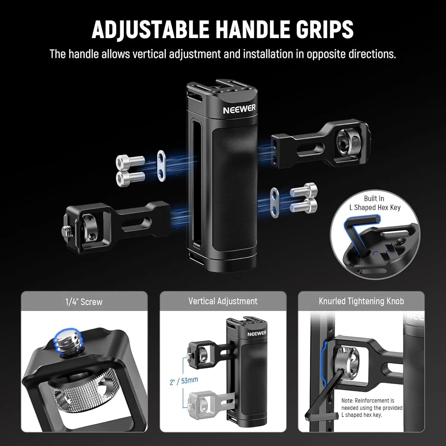 【Ergonomic Contoured Handles】 Two side handles feature contoured silicone grips for comfort and security. They can connect to the cage by thumbscrews in vertical or horizontal directions. With the L shaped hex key, you can tighten the handles or adjust them up and down