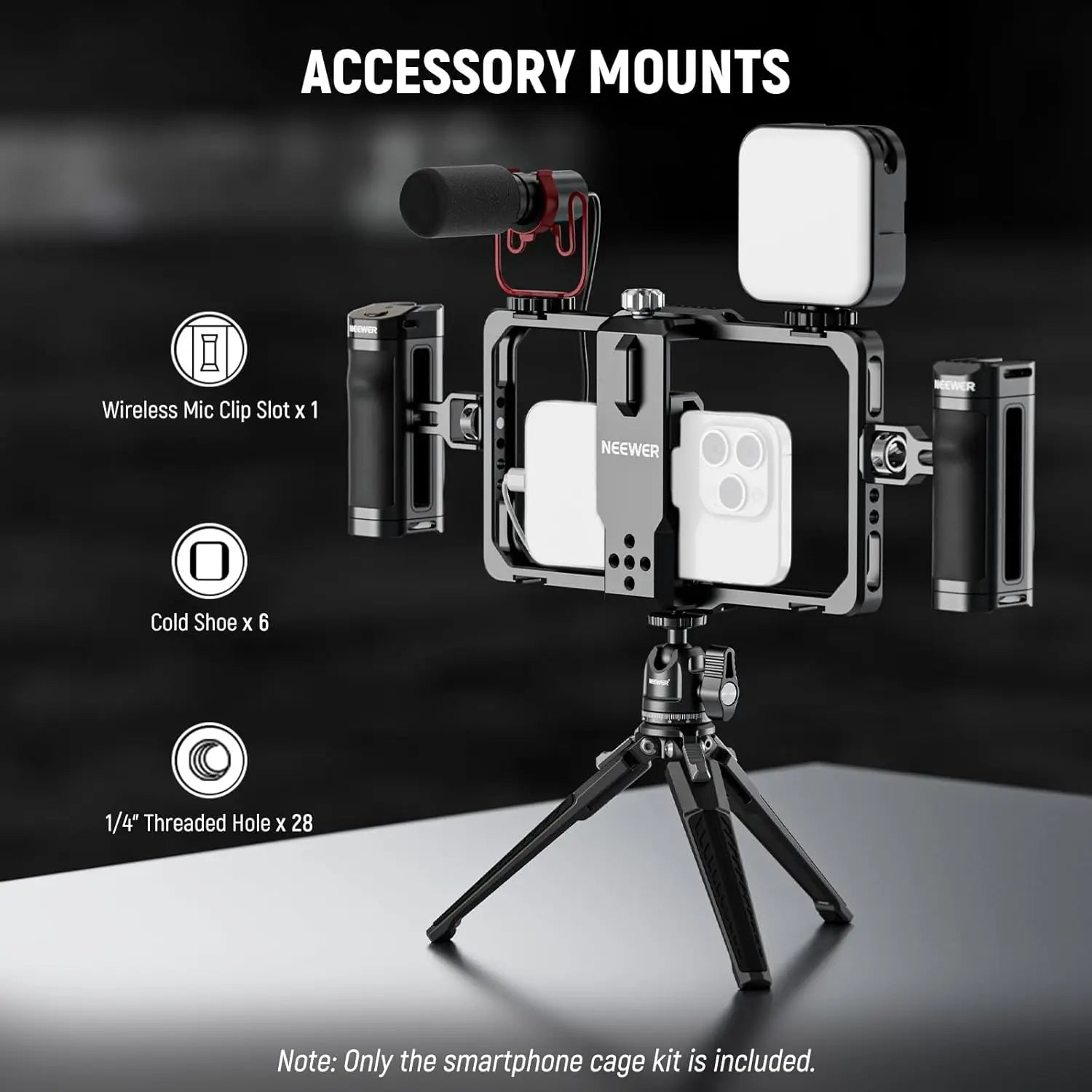 【Abundant Accessory Mounts】 1/4" threads can mount the phone cage to a tripod, such as NEEWER LT35 Travel Tripod and T30 Flexible Tripod, or connect CA070 Shoulder Strap. Cold shoe mounts can connect our CM14 Pro Microphone and PL81/RGB62 LED Video Lights for enhanced video quality. The back slot can clip CM22/CM28 Wireless Microphone Transmitters