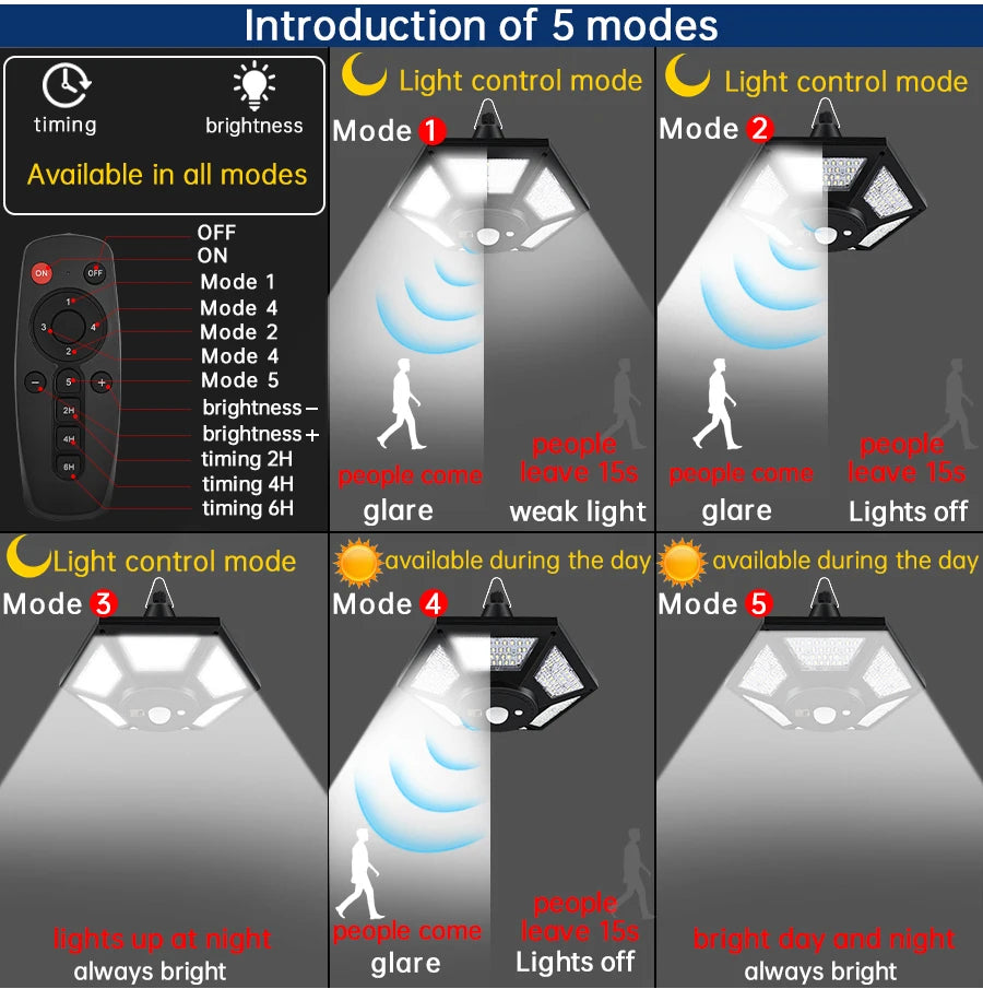 【5 Lighting Modes with Motion Sensing】--Our solar pendant lights built-in high sensitive motion sensor detector, With human body sensing function and have 5 working modes. brightness can be adjustable, meet all needs