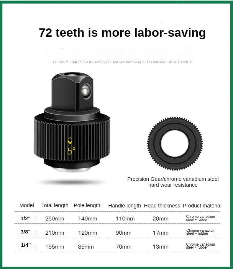 1/4 3/8 1/2 Inch Ratchet Wrench 72 Tooth Drive Ratchet Socket Wrench Tool Multi-funtion DIY Hand Tool Ratchet Handle Wrench