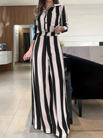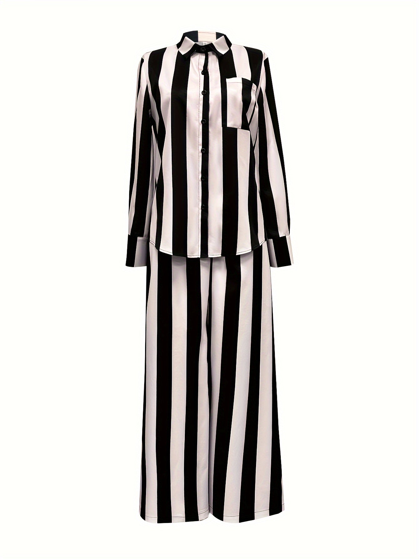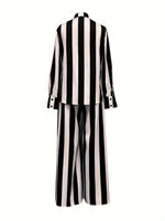 2 Pcs Stripe Print Shirt & Pants Set, Long Sleeve Button Up Shirt & High Waist Straight Leg Pants Outfits, Women's Clothing