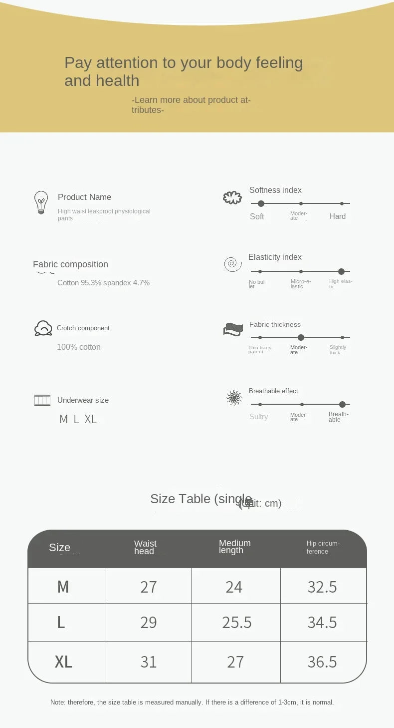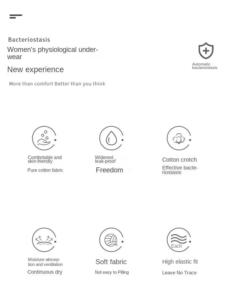 3 layers of anti-leakage: the inner layer is easy to clean; the inner crotch + the middle waterproof TPU coating + the outer layer of elastic cotton