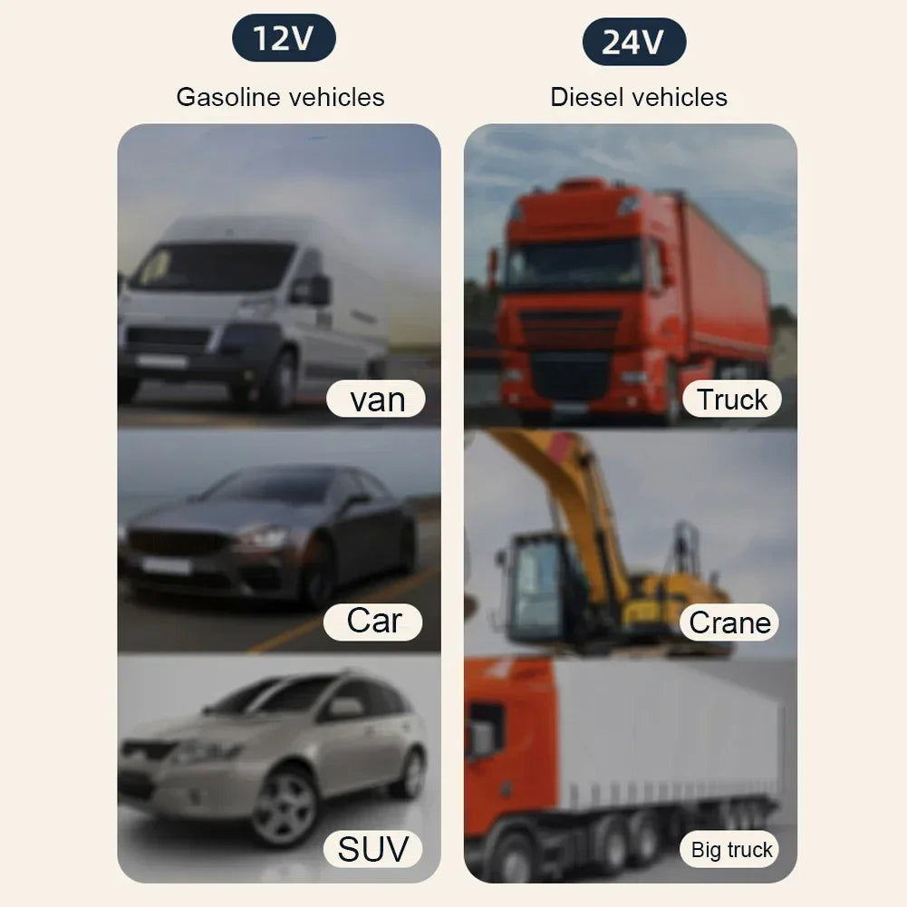 12V: cigarette lighter interface, suitable for minibuses, school buses and off-road vehicles.