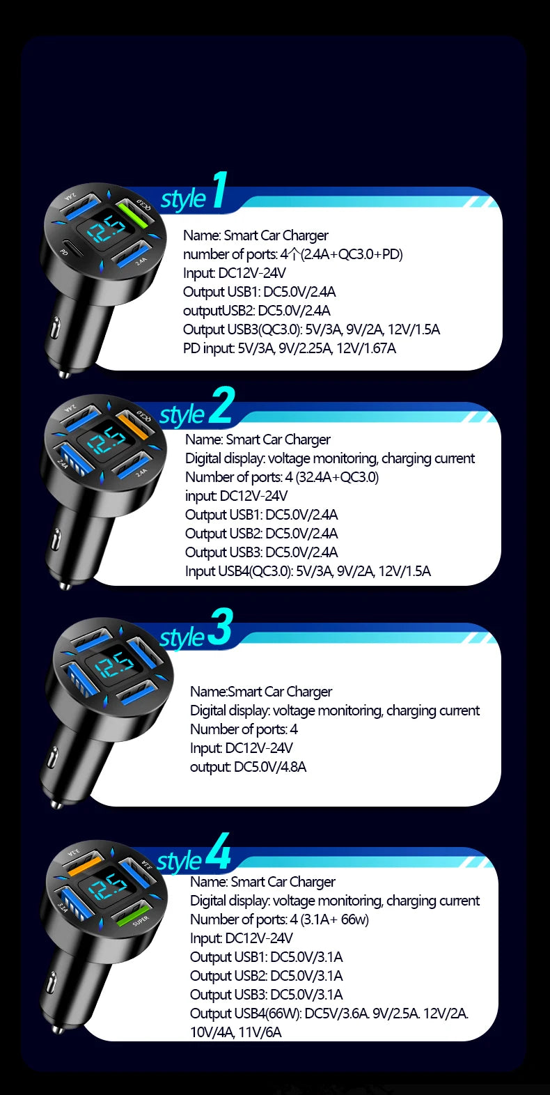 According to the research data, the product has been upgraded. There are some changes in the 66W 4USB and 4USB styles: the car charger has font printed on it, which is more convenient to use. Thank you.