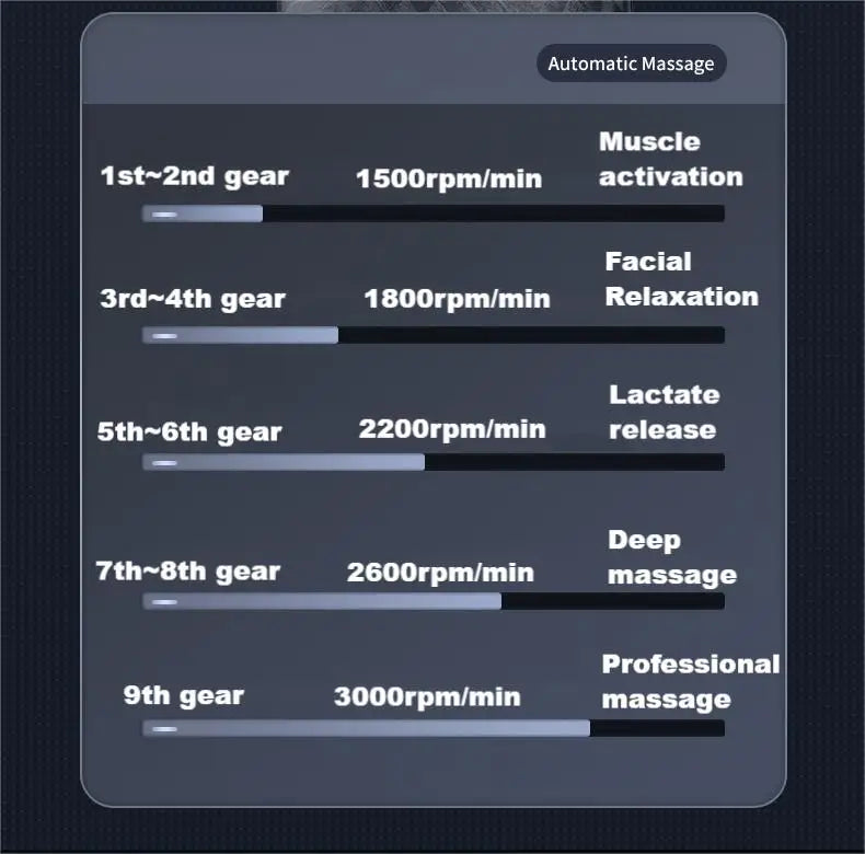 [9 levels ] The frequency can be adjusted according to the different parts of the massage. The high-power motor will bring 1500-3000 strikes per minute. The user can change the speed of the massage gun as needed to provide a relaxing massage for each muscle.