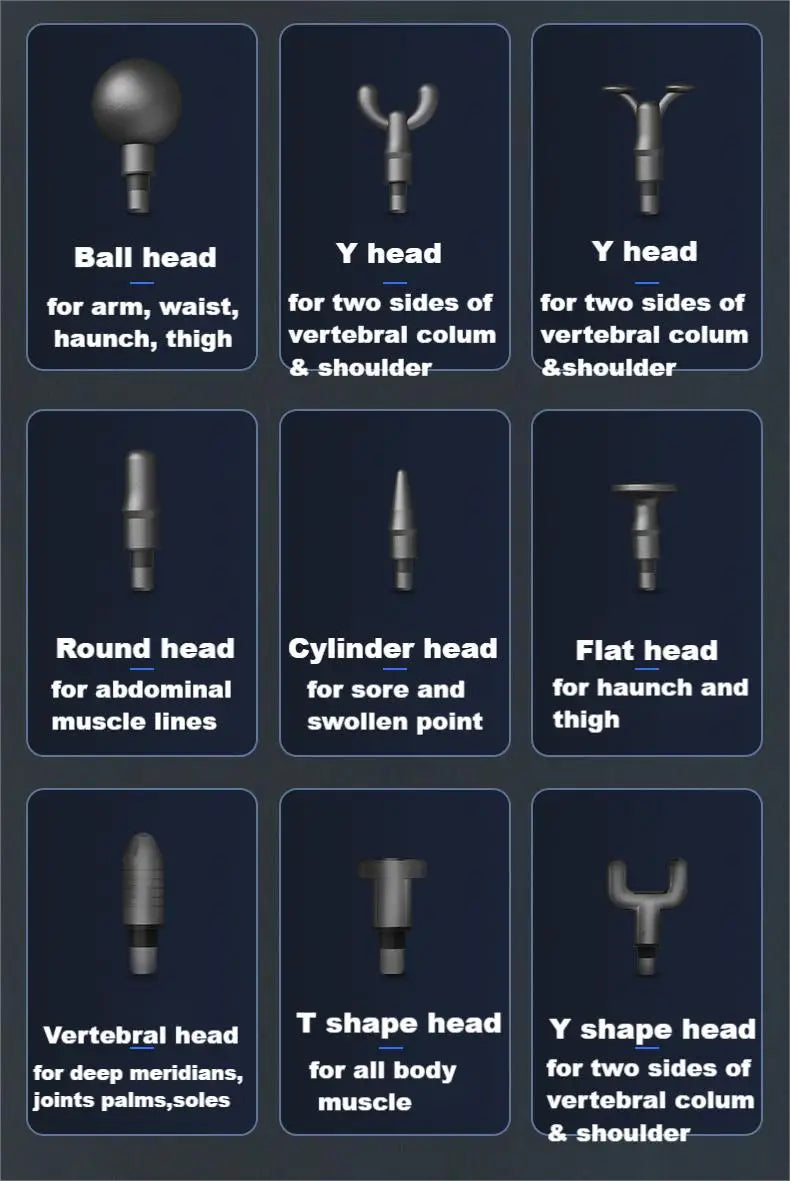 [Multifunctional massage gun] The deep tissue massage gun has 9 different massage heads, each of which is aimed at different muscles. After the massage gun hits the muscles, it can promote blood circulation, decompose lactic acid, and relieve muscle soreness after exercise.