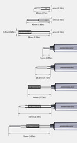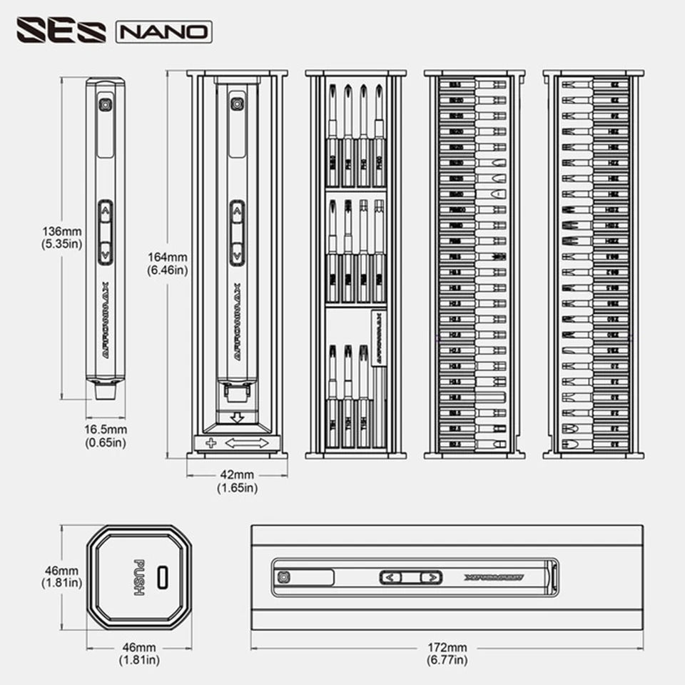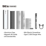 The SES NANO includes a set of 59 screwdriver bits and an extension tip, encompassing Phillips, star, and nut drivers, with hex shafts that are 4mm (0.155") thick. These versatile bits are designed to help you handle any screw-related task, even in unforeseen circumstances.