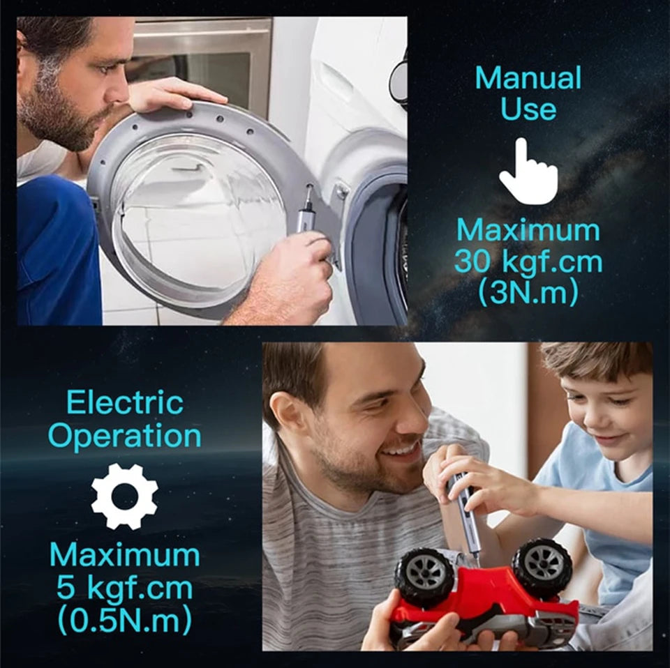 SES NANO incorporates patented technology that automatically switches to manual mode when the electric mode lacks sufficient torque. This dual-mode functionality enhances the user experience and makes SES more versatile. Both manual modes offer 30 kgf·cm of torque and electric mode, you have the flexibility to effortlessly tighten or loosen screws by simply twisting for additional power.