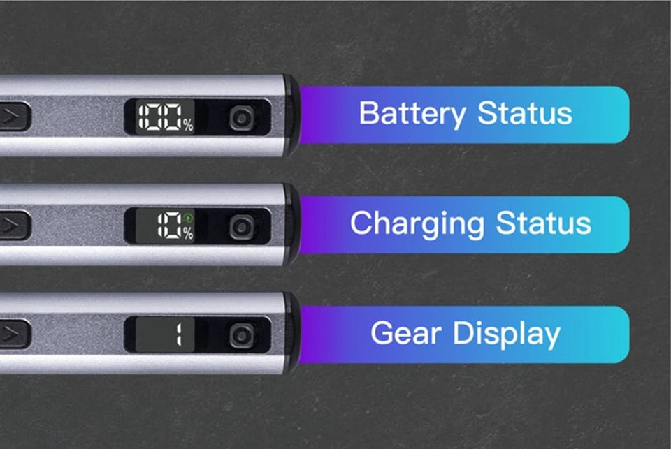 The LED screen provides a clear display of the battery status, charge level, selected mode, remaining battery life, and charging status for user convenience.