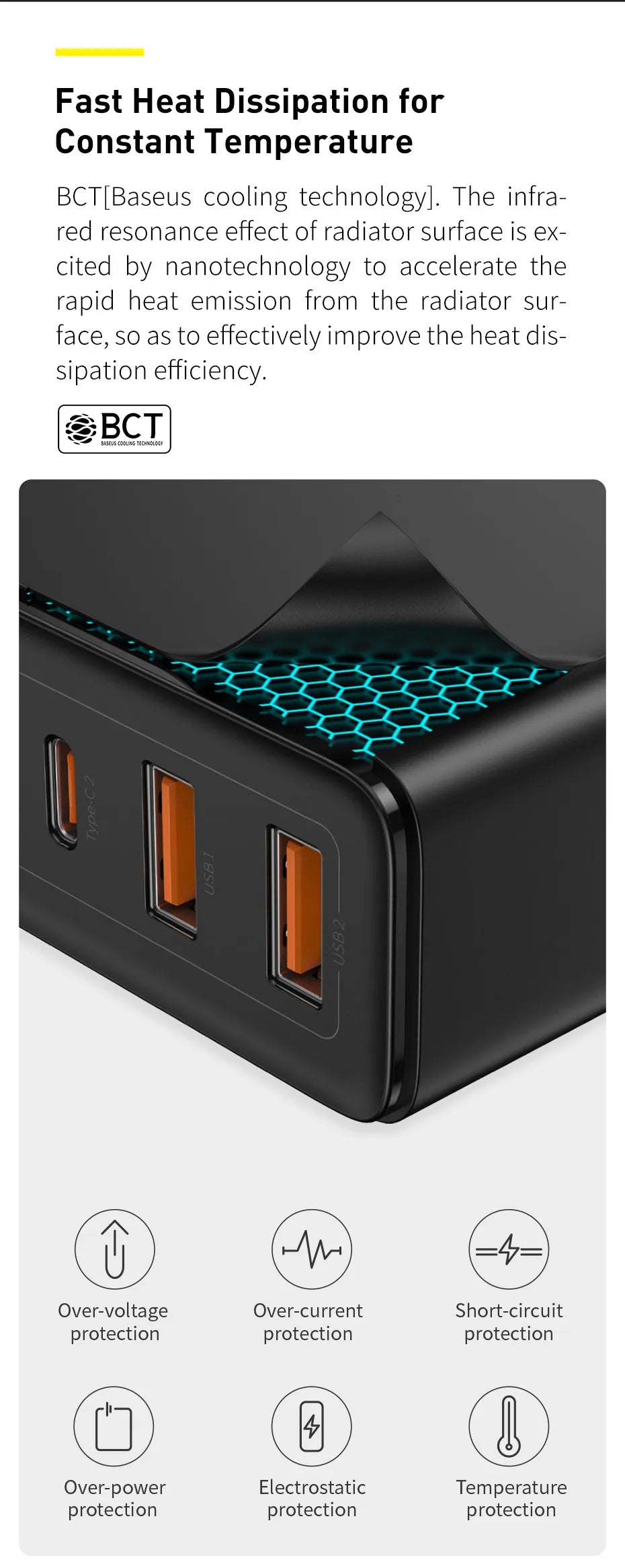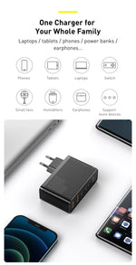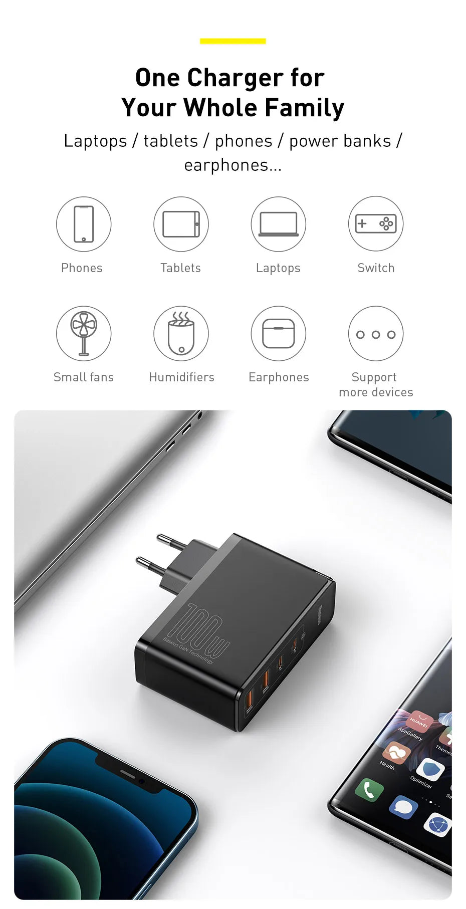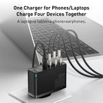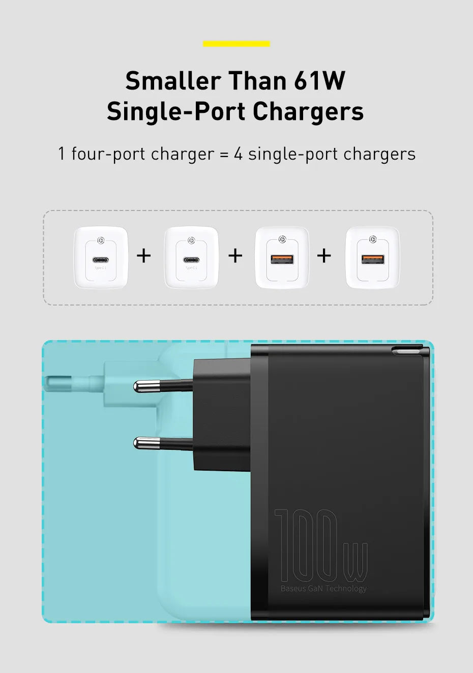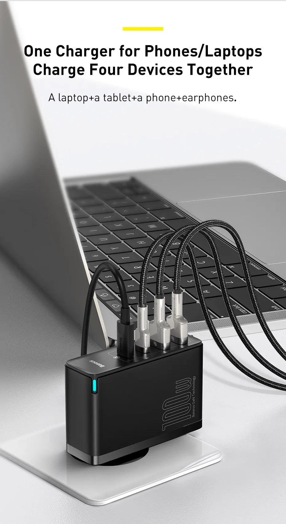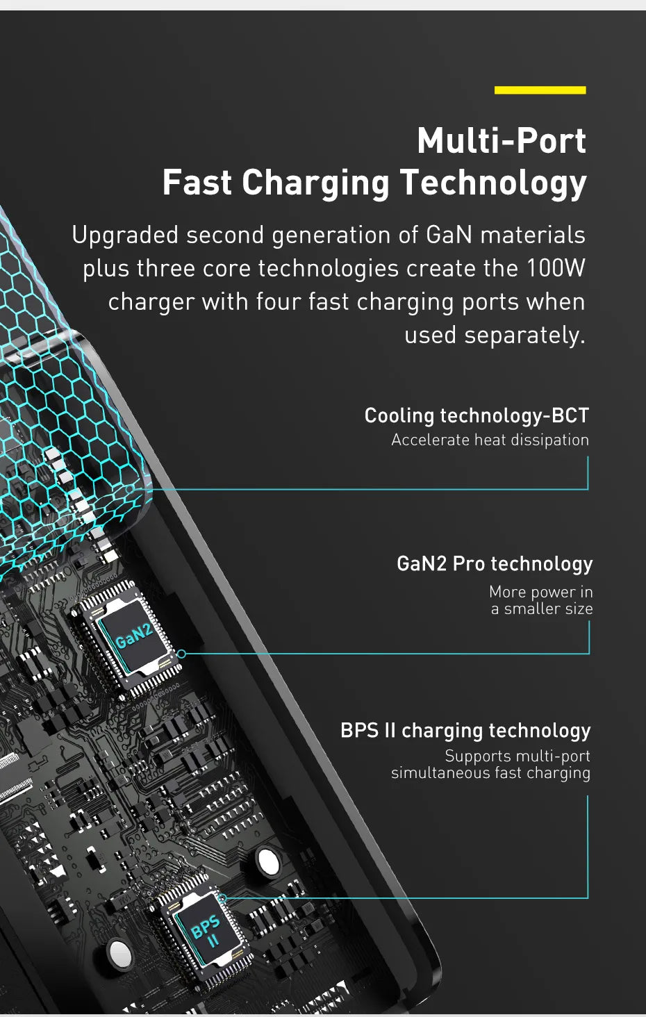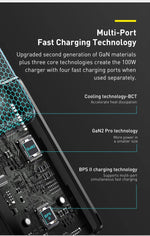 Upgraded second generation of Gan materials plus three core technologies creat the 100w charger with four fast charging ports when used separately