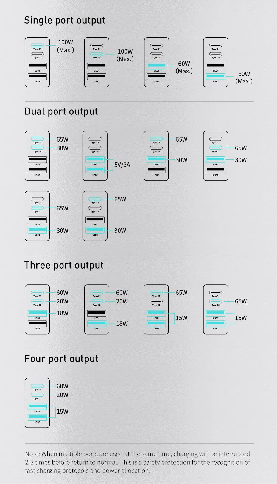 Type C 1 + Type C 2 + USB 1 Output: 60W + 20W + 18W