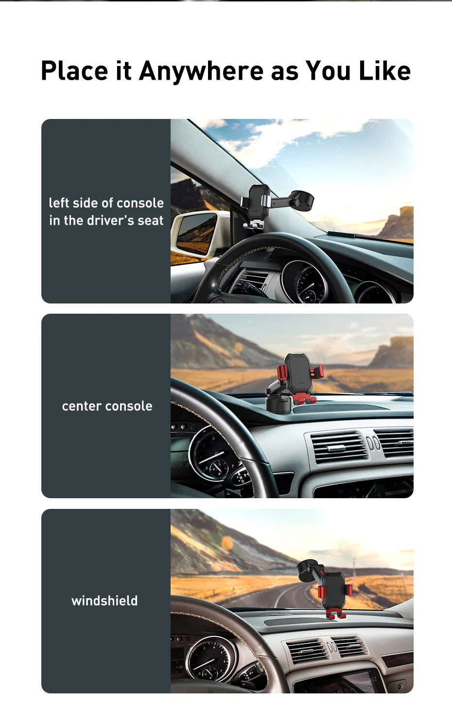 Clamp firmly / without blocking the screen / one-handed pick and place / gavity linkage