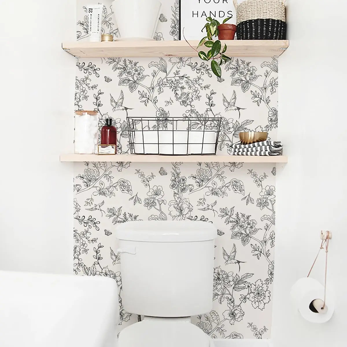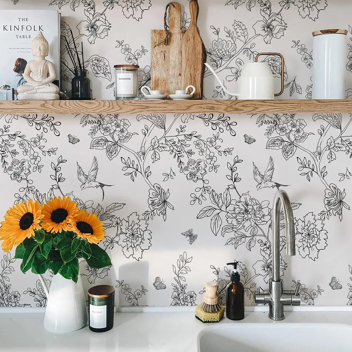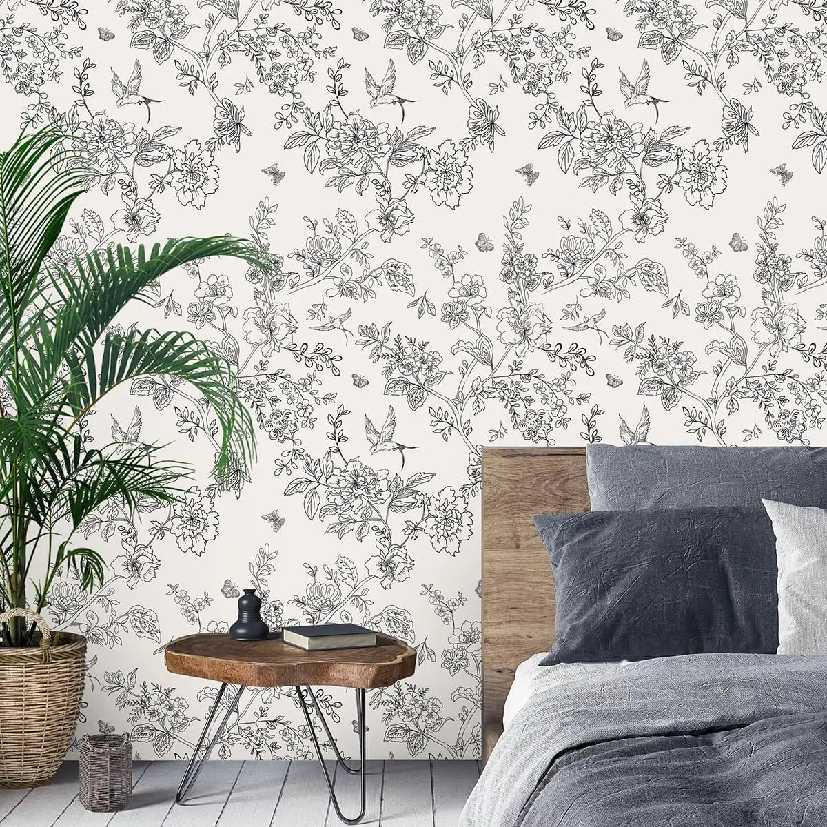Black and White Floral Wallpaper Peel and Stick Wallpaper Floral Contact Paper Flowers Birds Removable Self Adhesive Wallpaper