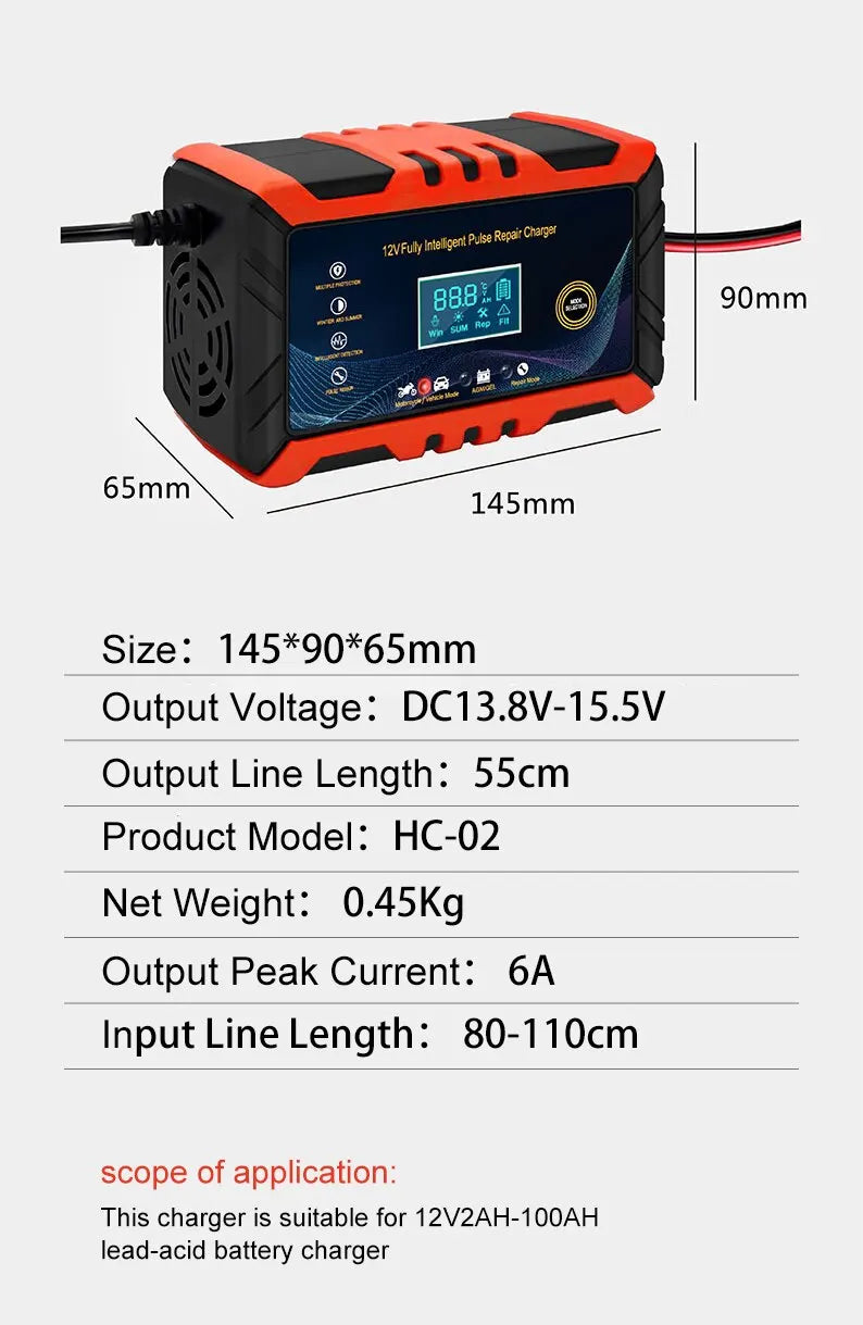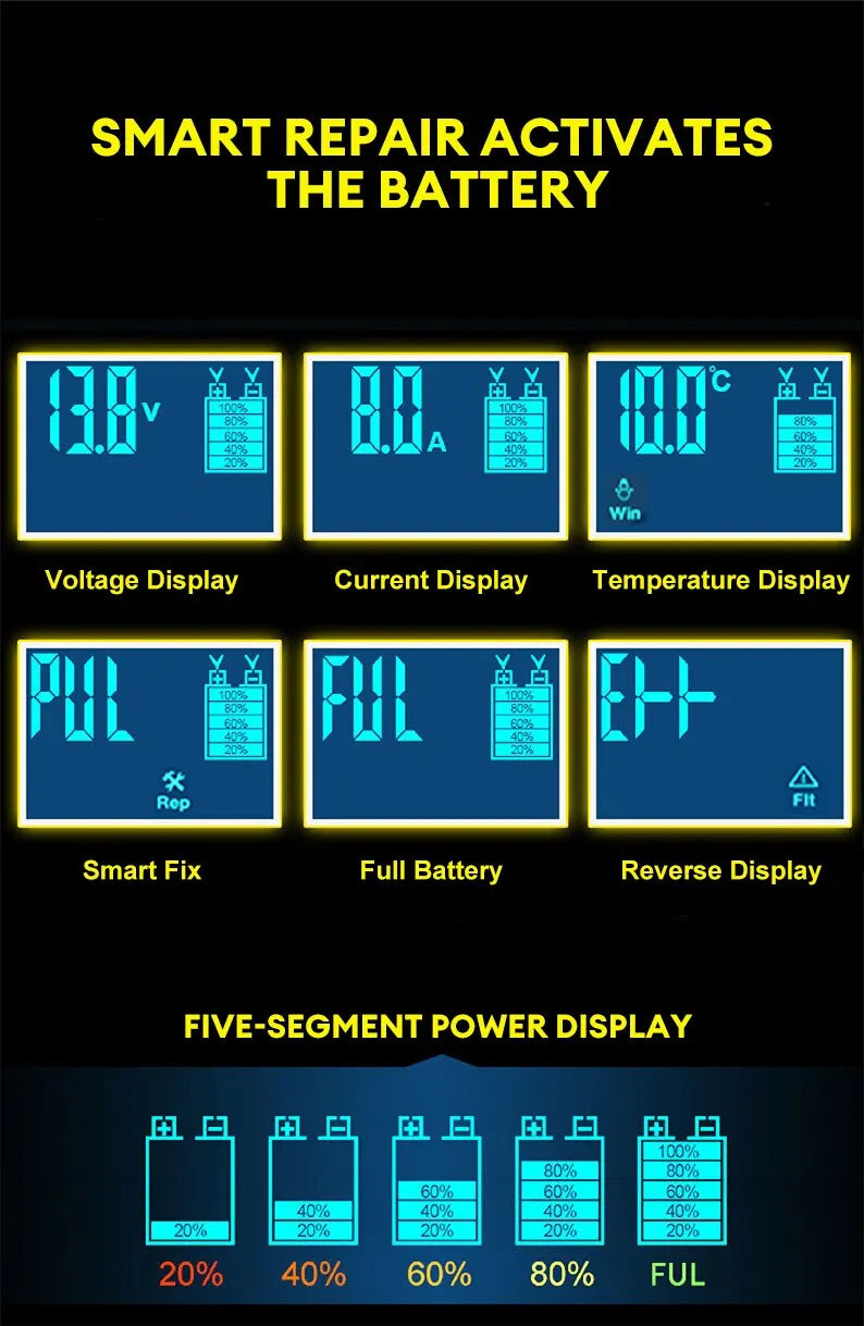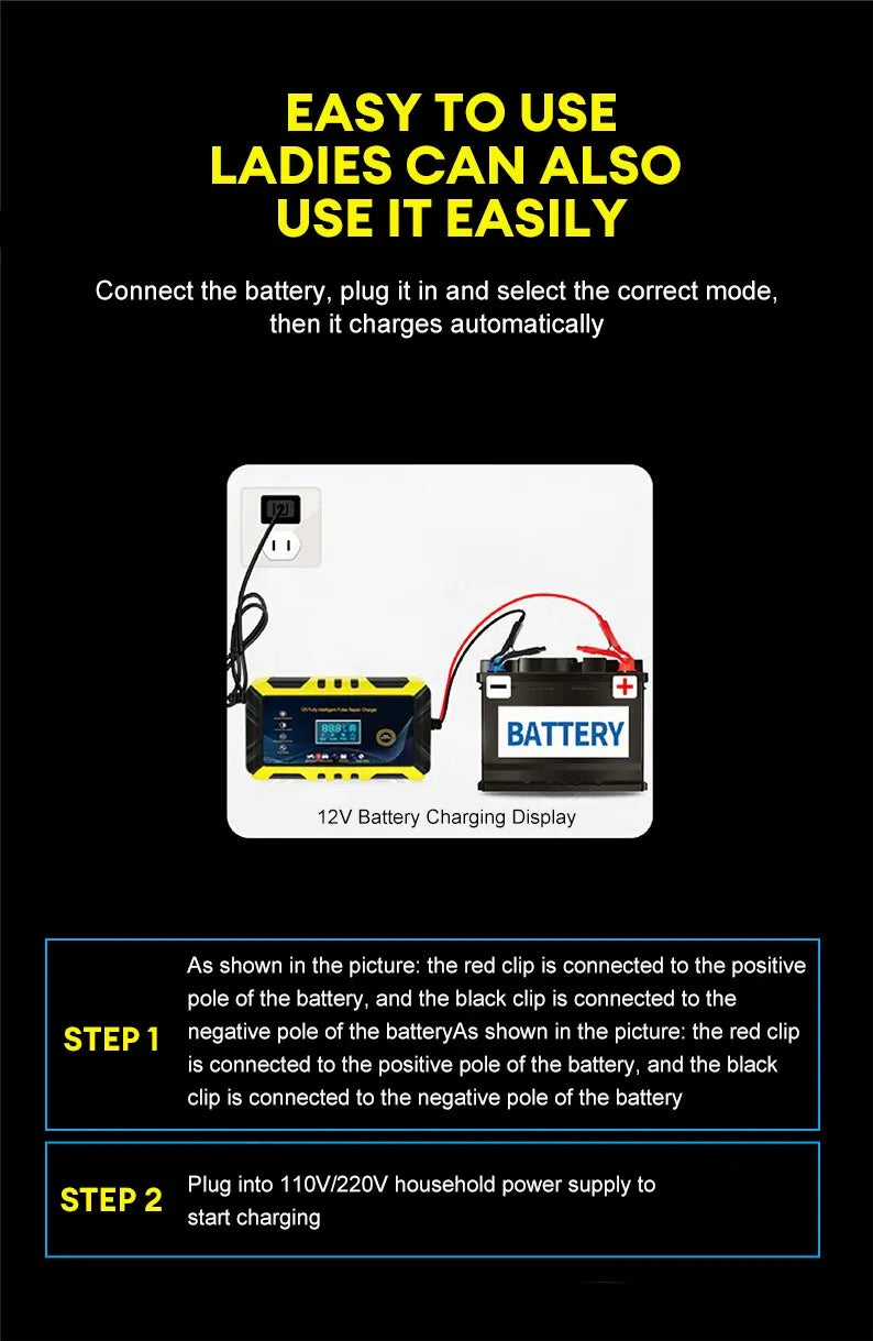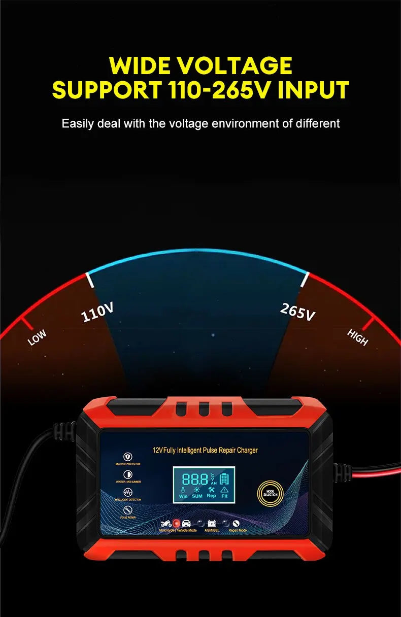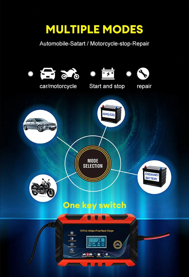 • Intelligent Pulse Repair :The charger uses intelligent pulse repair technology to diagnose and fix battery problems, ensuring your car or motorcycle battery is always in top condition.