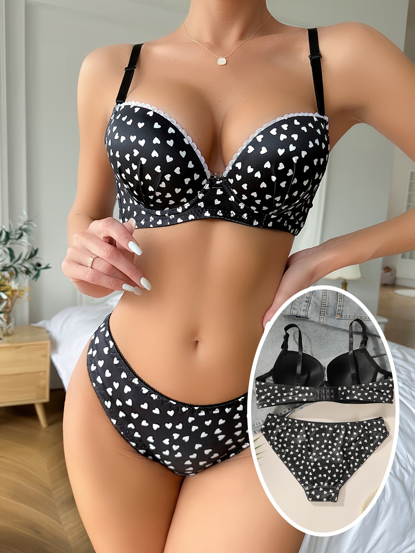 Chic Black Polka Dot & Heart Print Bikini Set - Sexy, Comfortable Polyester Blend Lingerie for Women