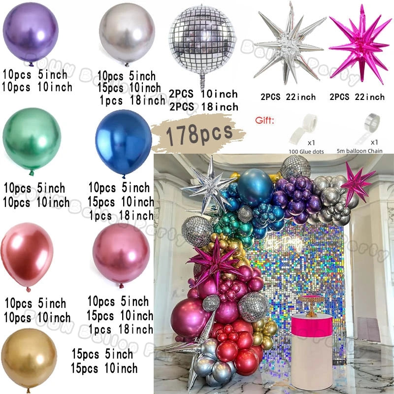 Chrome Balloons Garland Arch Kit Disco Party Decoration with Metallic Purple Green Red Hot Pink Blue and Foil Disco Ball Balloon
