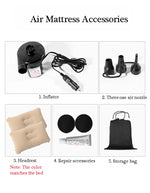 All accessories: air bed*1, pillow*2, air pump*1, three-purpose air nozzle*1, repair kit*1, storage bag*1