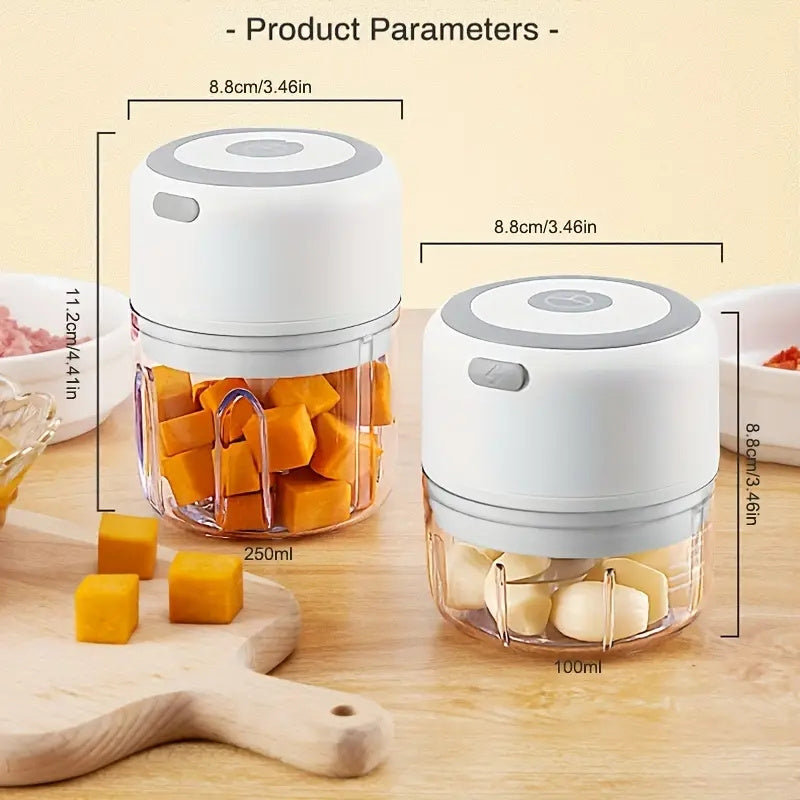 Electric Mini Garlic Chopper with a Capacity of 100/250Ml, USB Meat Grinder, And Garlic Crusher. It Is a Robust Tool for Crushing Ginger And Vegetables, Featuring a Safety Switch And a Thickened Design.