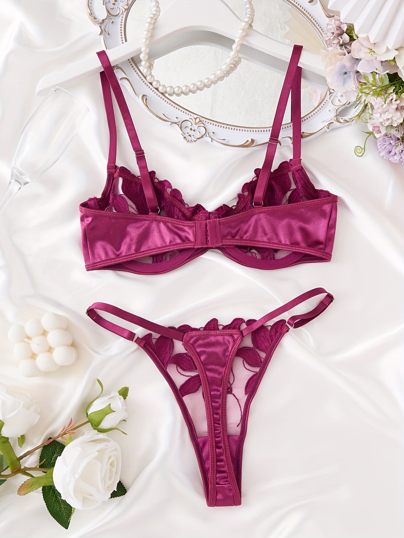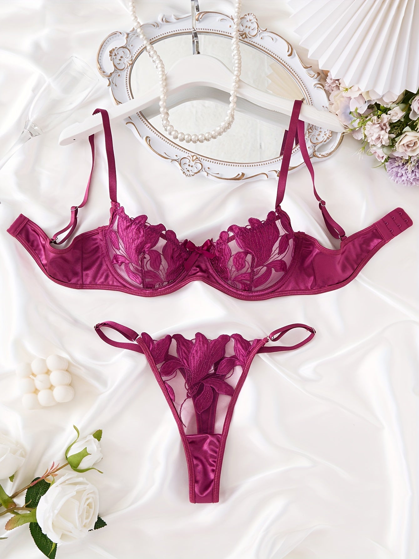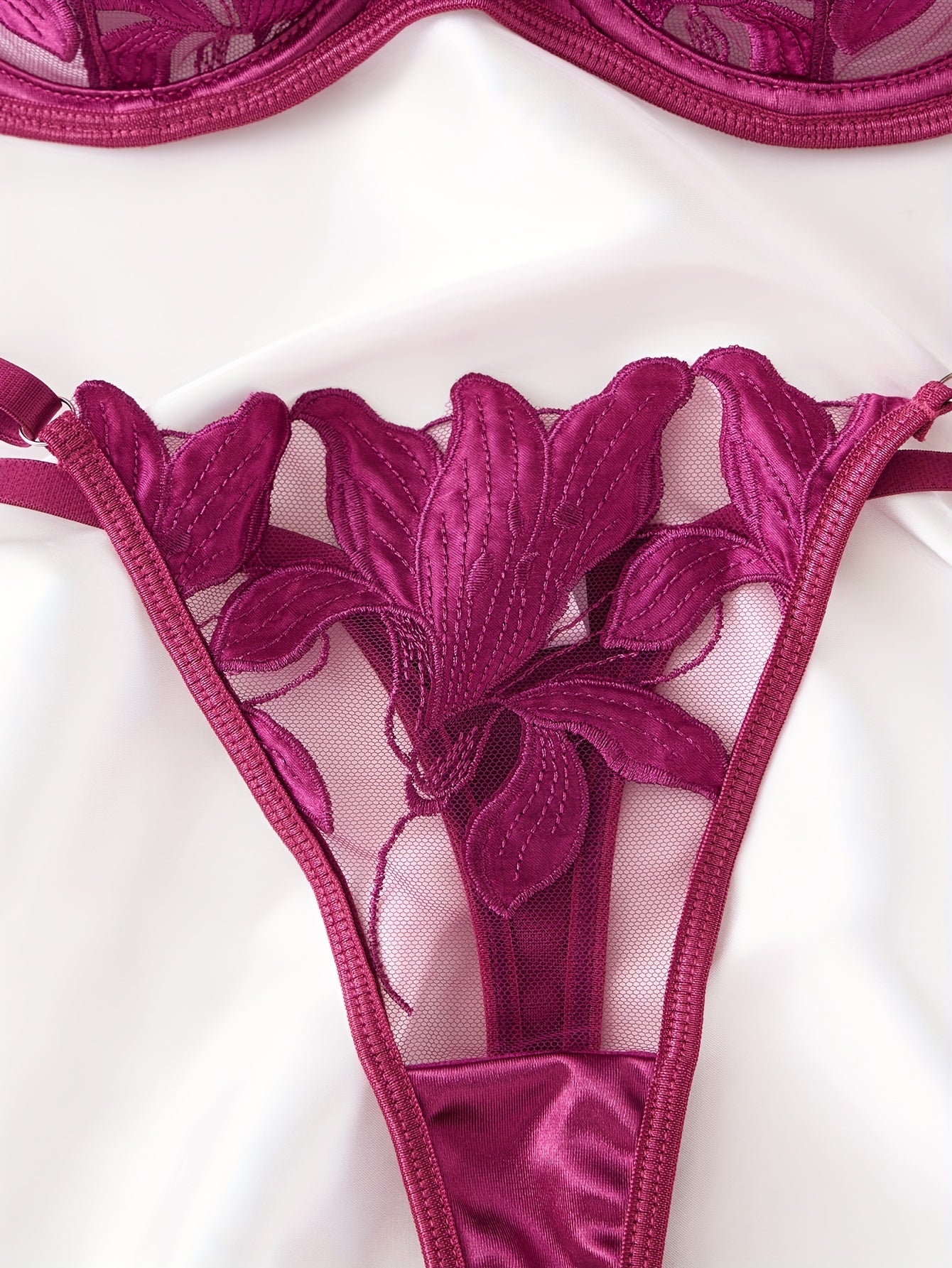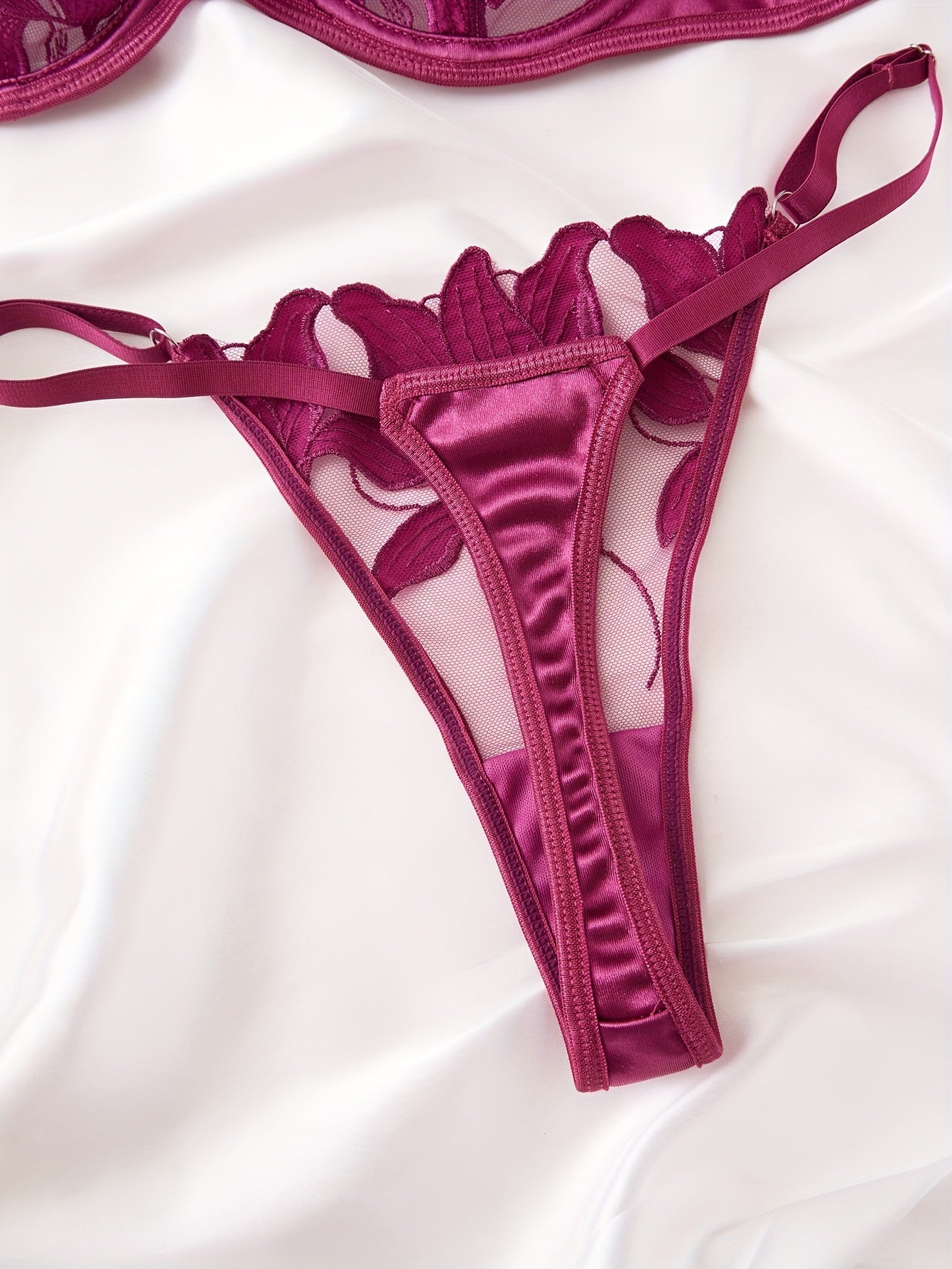 Elegant Floral Embroidered Lingerie Set for Women - Sexy Sheer Bra and Thong Panty, No Padding, Medium Support Knit Fabric Undergarment Set with Polyester and Elastane