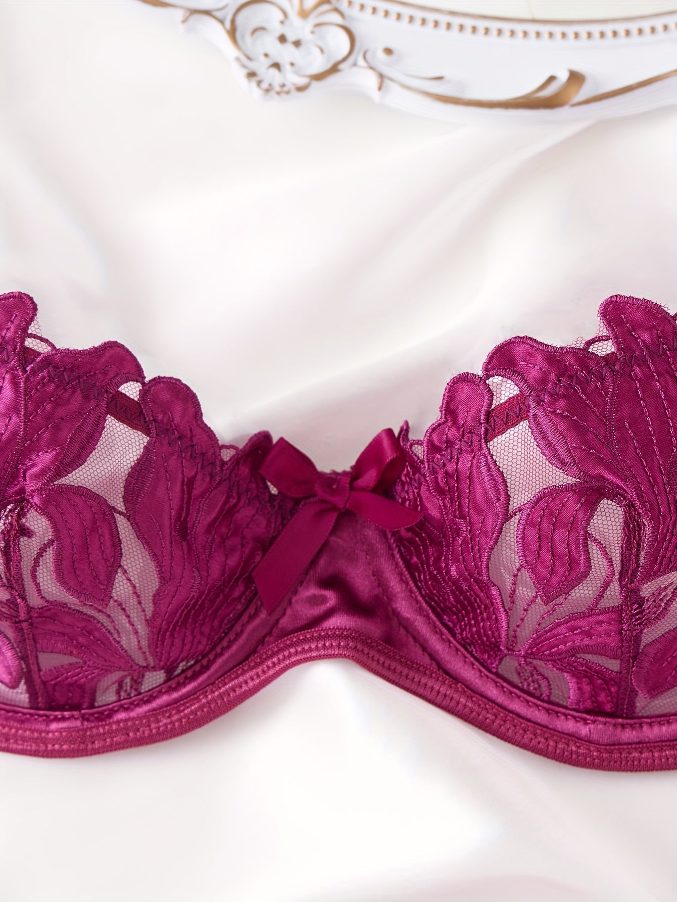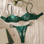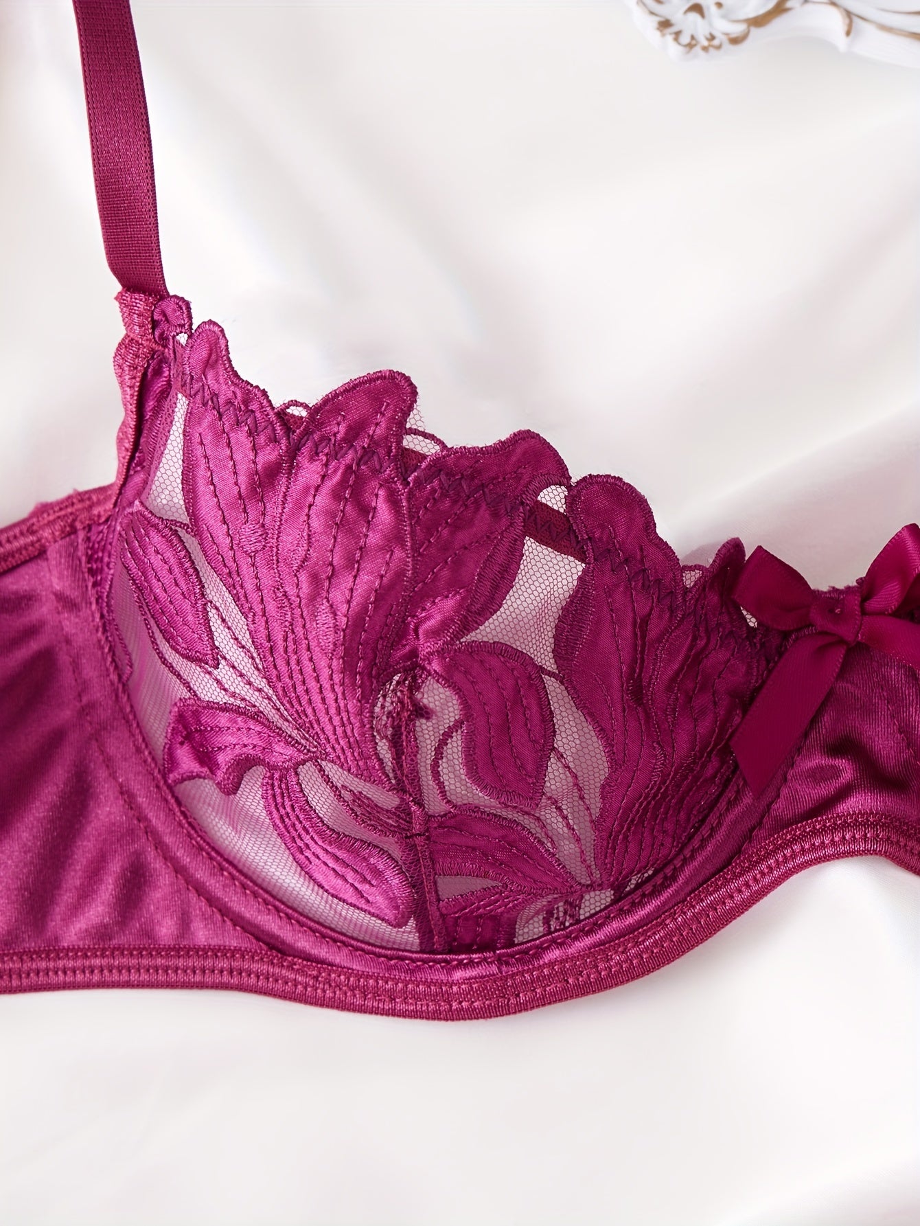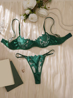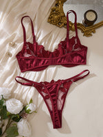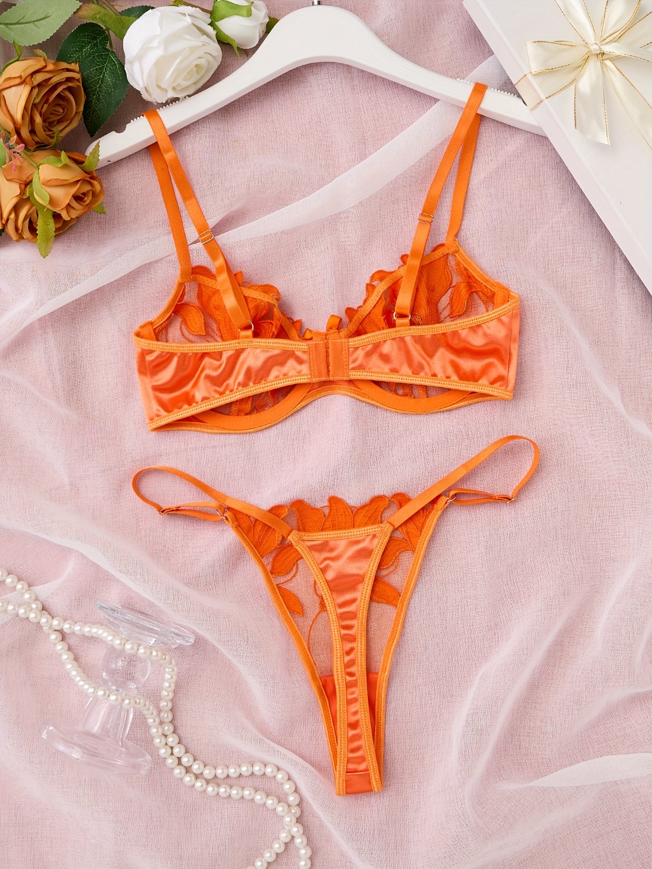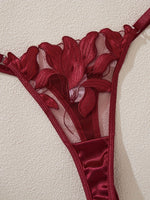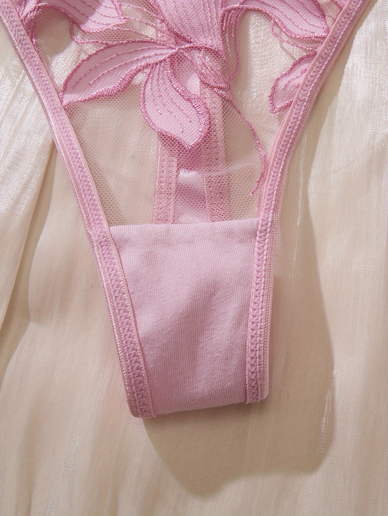 Elegant Floral Embroidered Lingerie Set for Women - Sexy Sheer Bra and Thong Panty, No Padding, Medium Support Knit Fabric Undergarment Set with Polyester and Elastane
