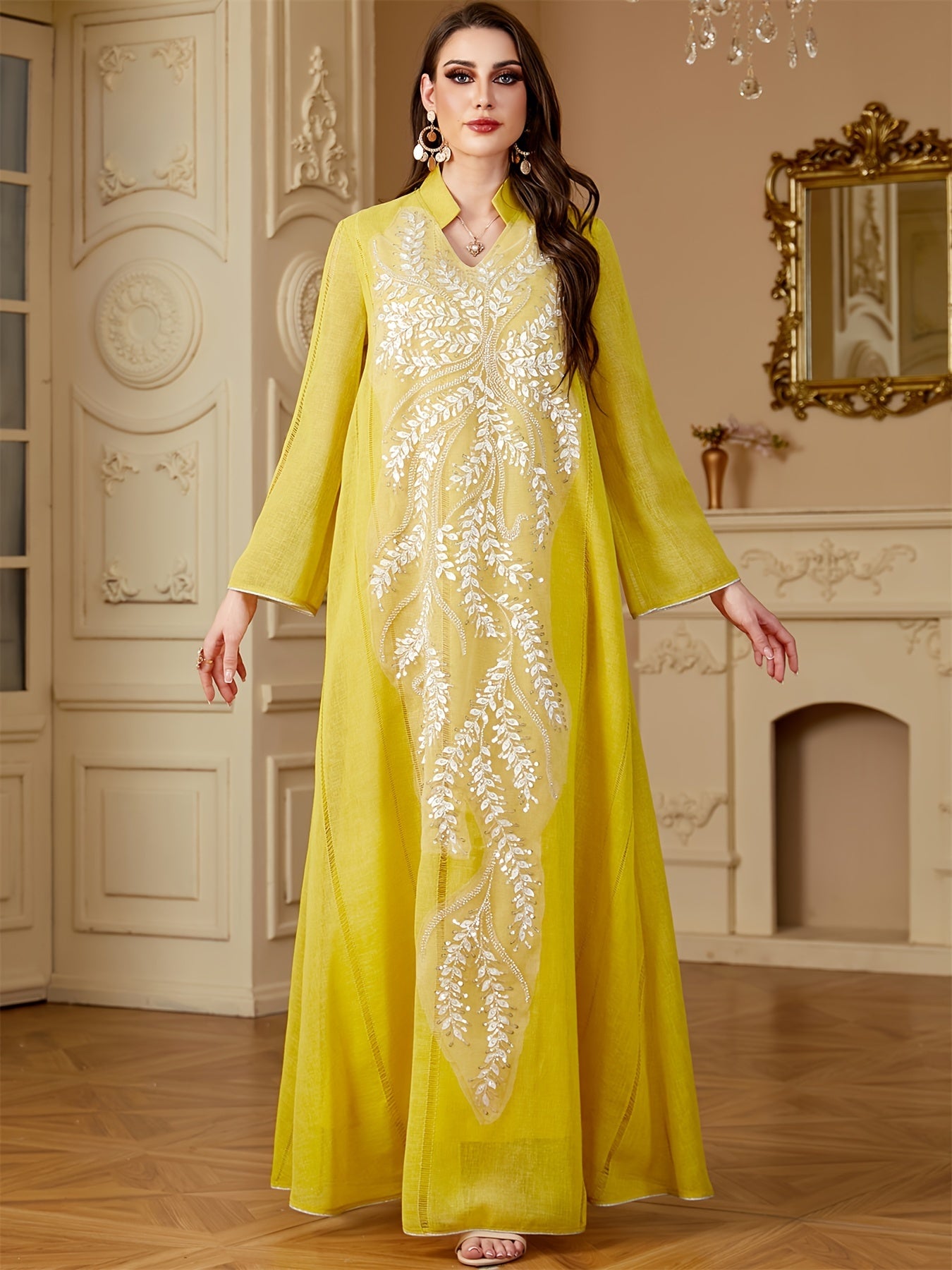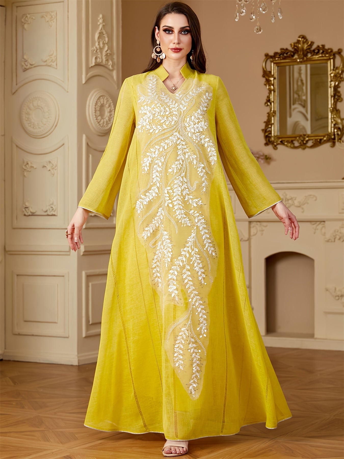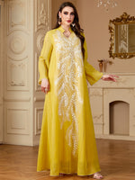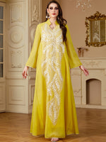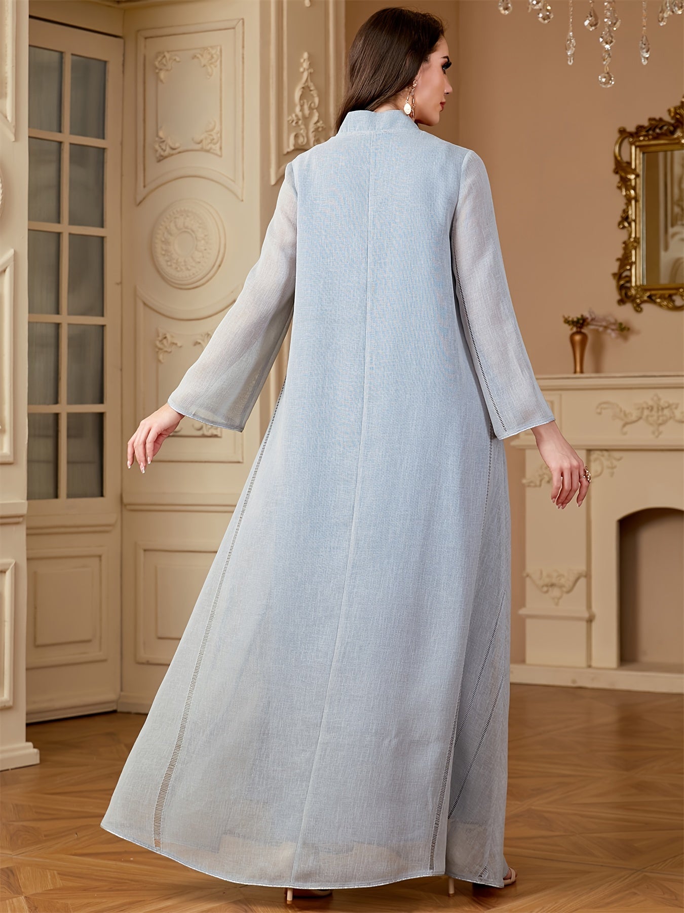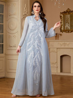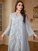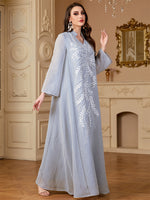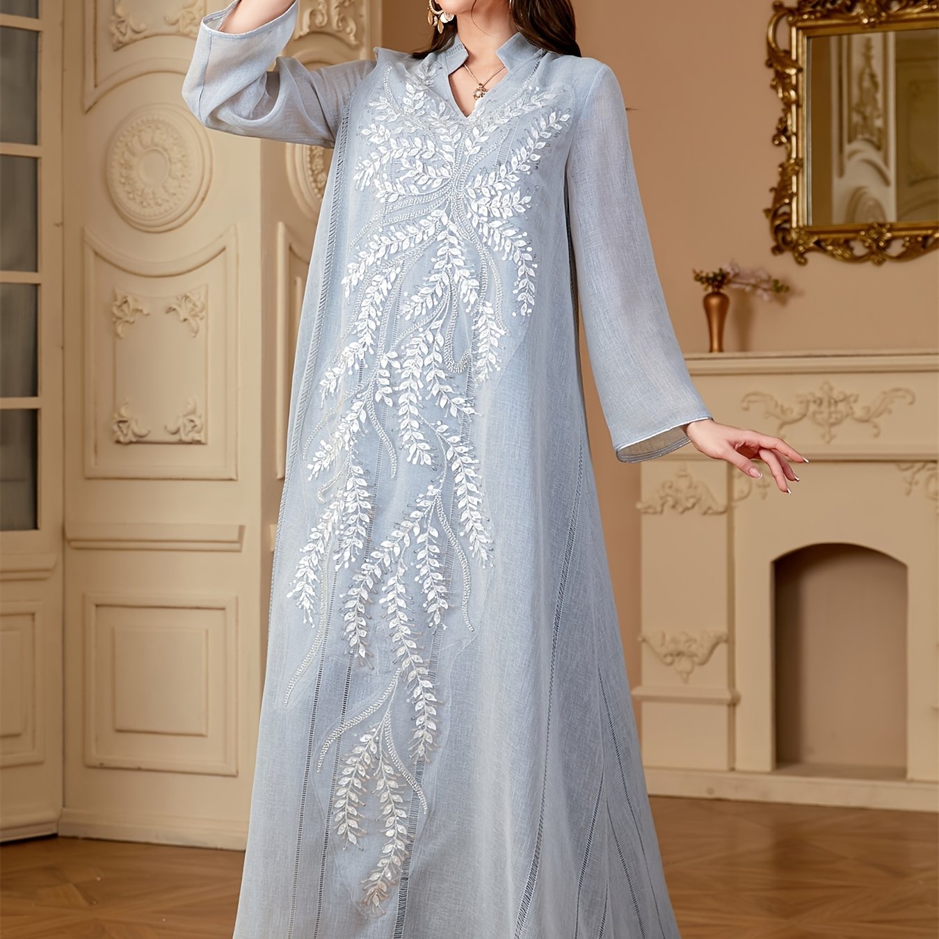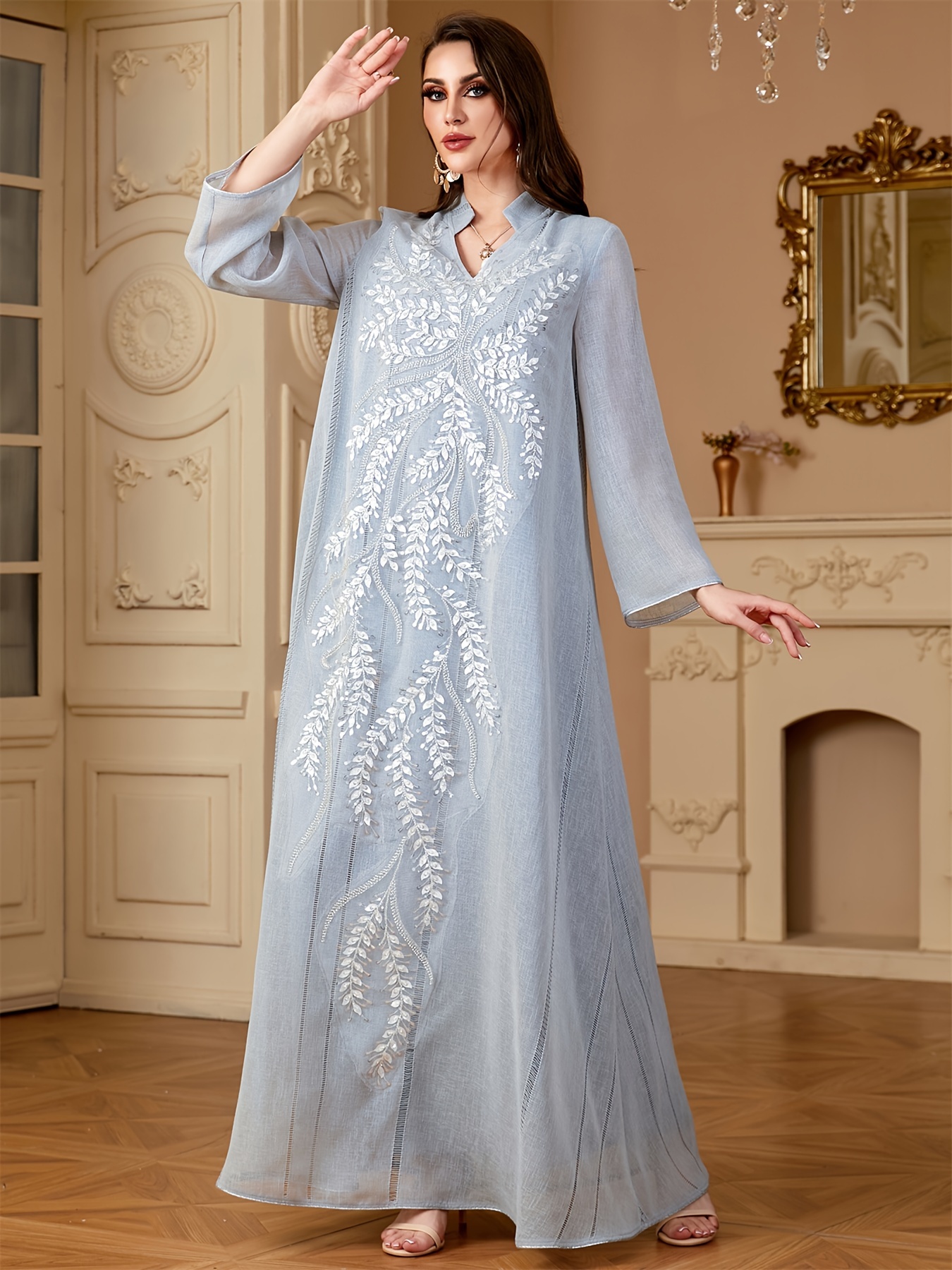 Elegant Light Blue Beaded Abaya for Muslim Women - V-Neck, Long Sleeve, Loose Fit Maxi Dress with Floral Patterns, Polyester, Non-Stretch Fabric - Perfect for Ramadan & Casual Wear