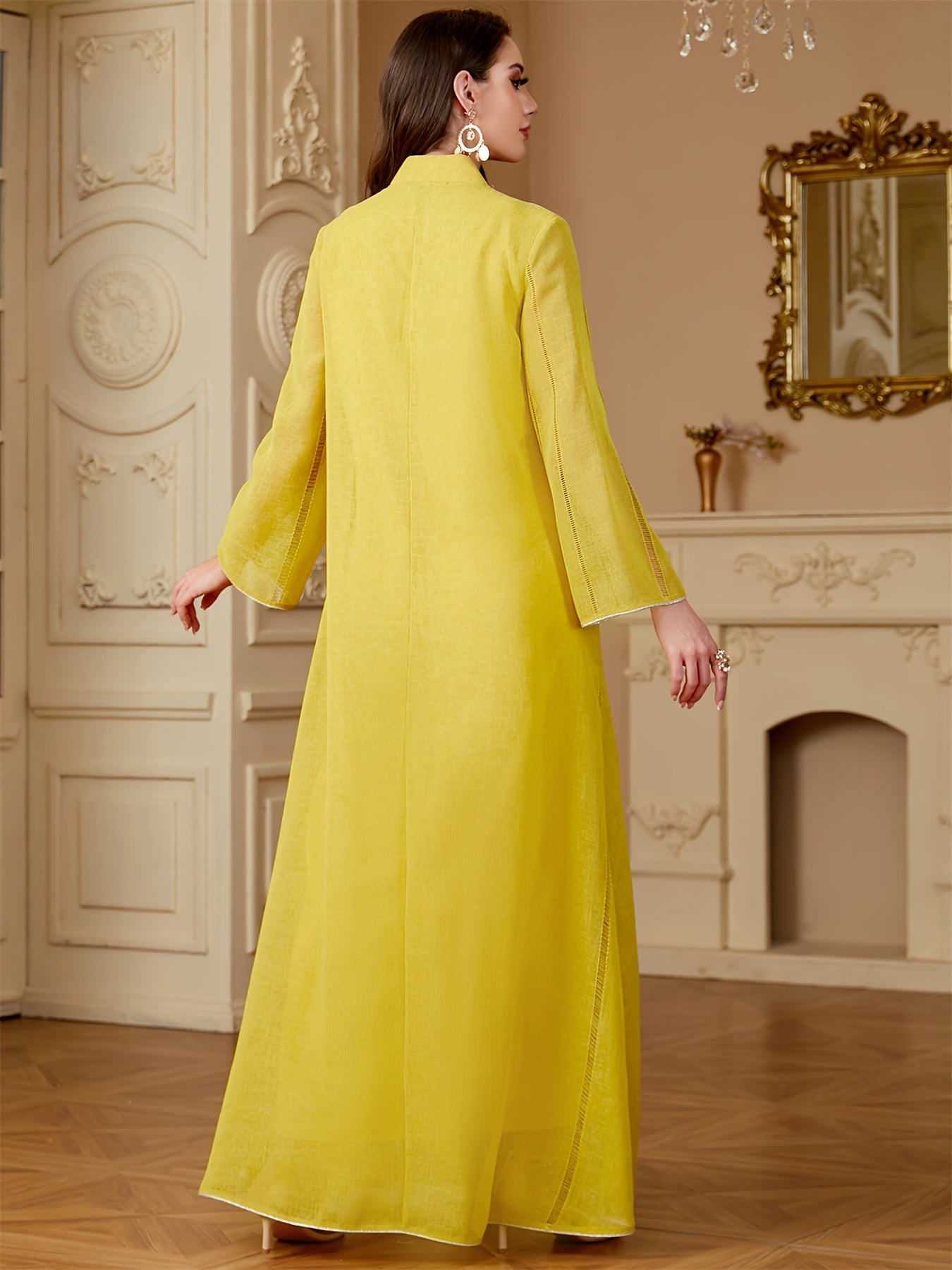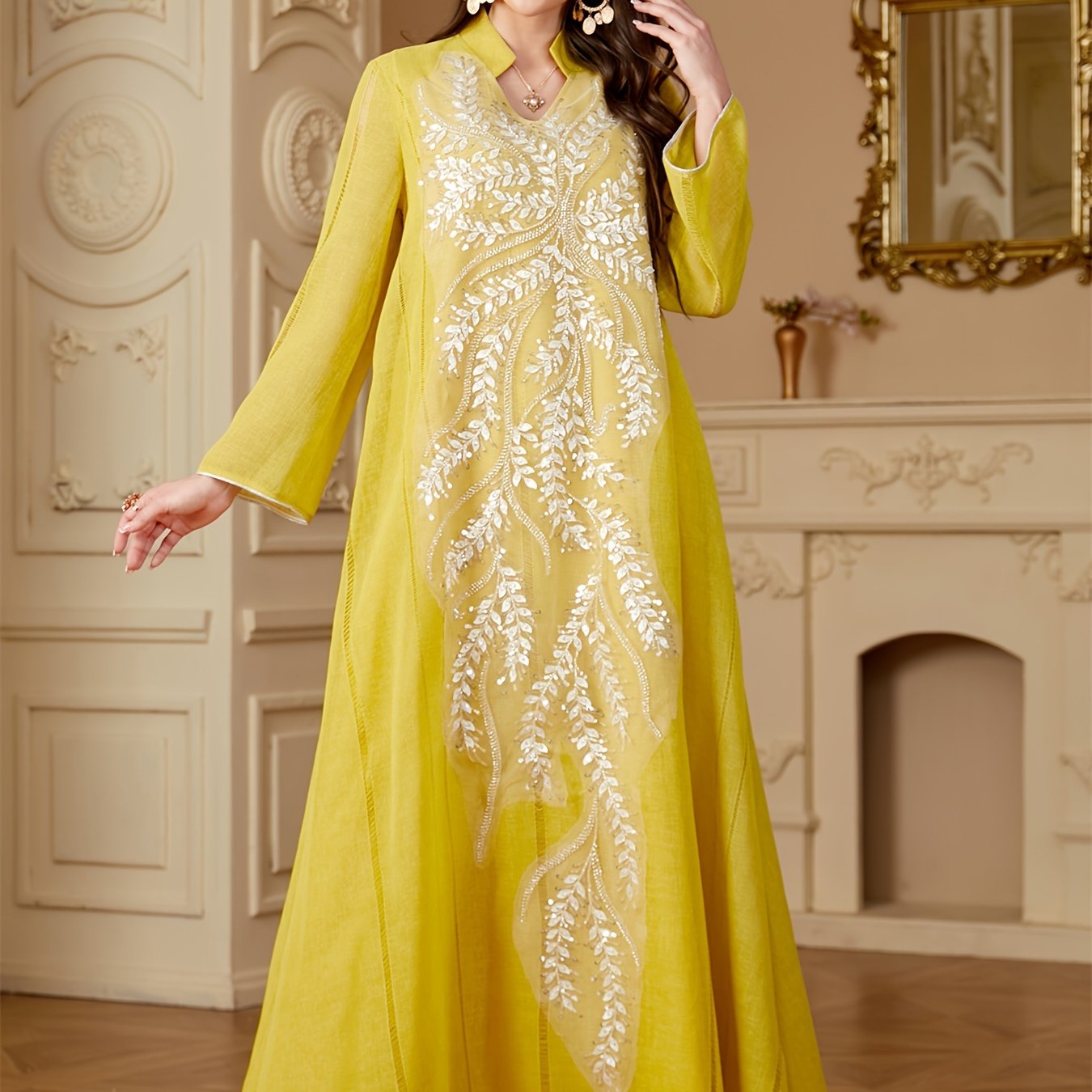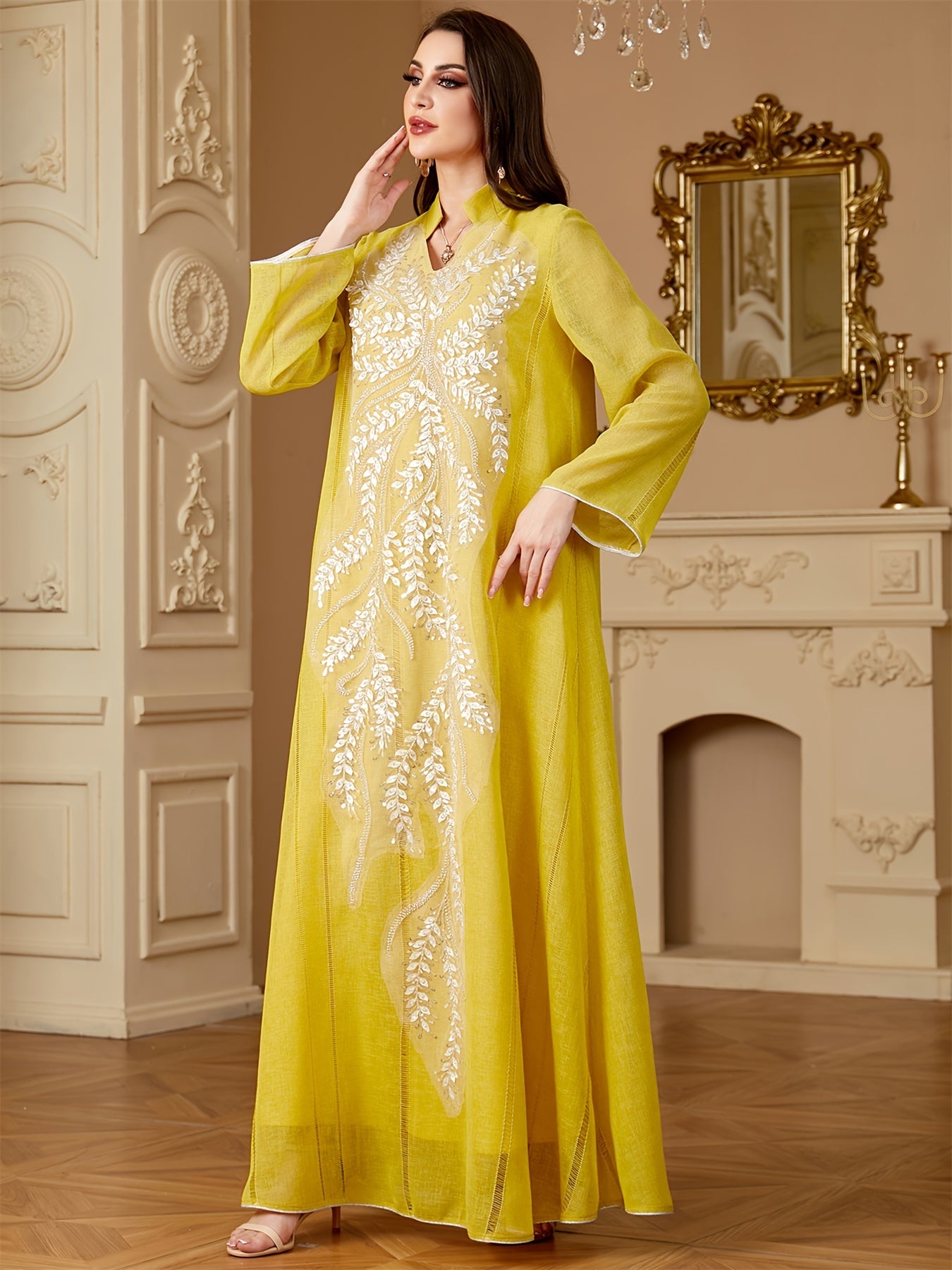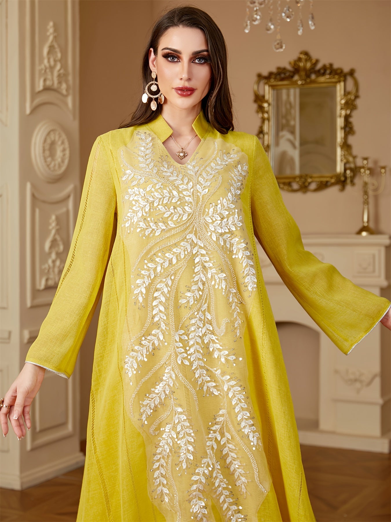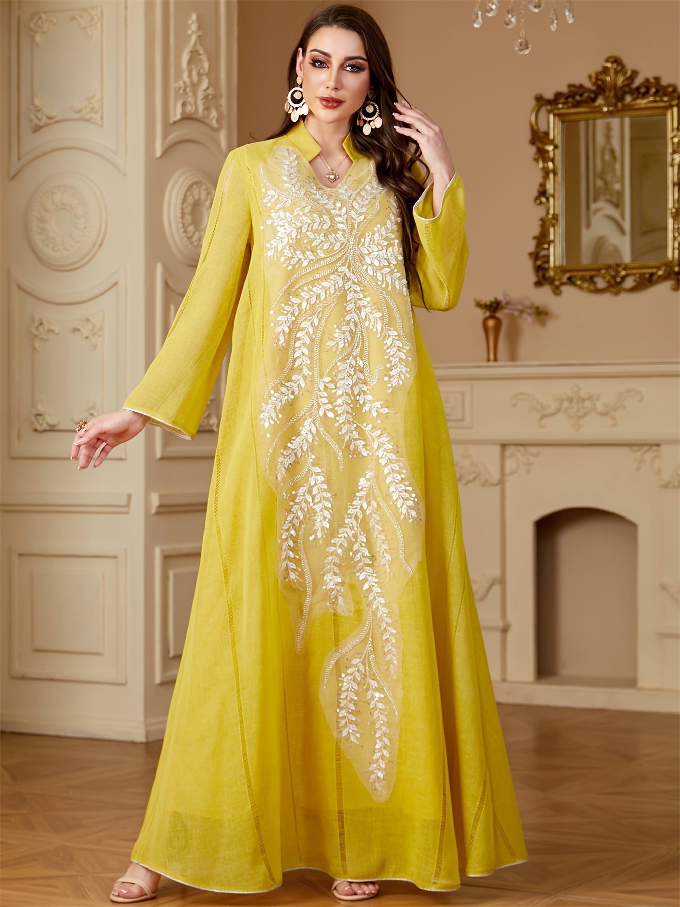 Elegant Light Blue Beaded Abaya for Muslim Women - V-Neck, Long Sleeve, Loose Fit Maxi Dress with Floral Patterns, Polyester, Non-Stretch Fabric - Perfect for Ramadan & Casual Wear