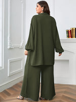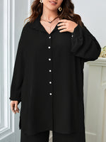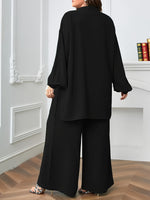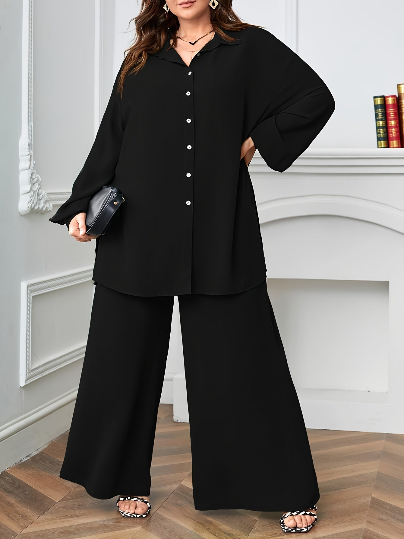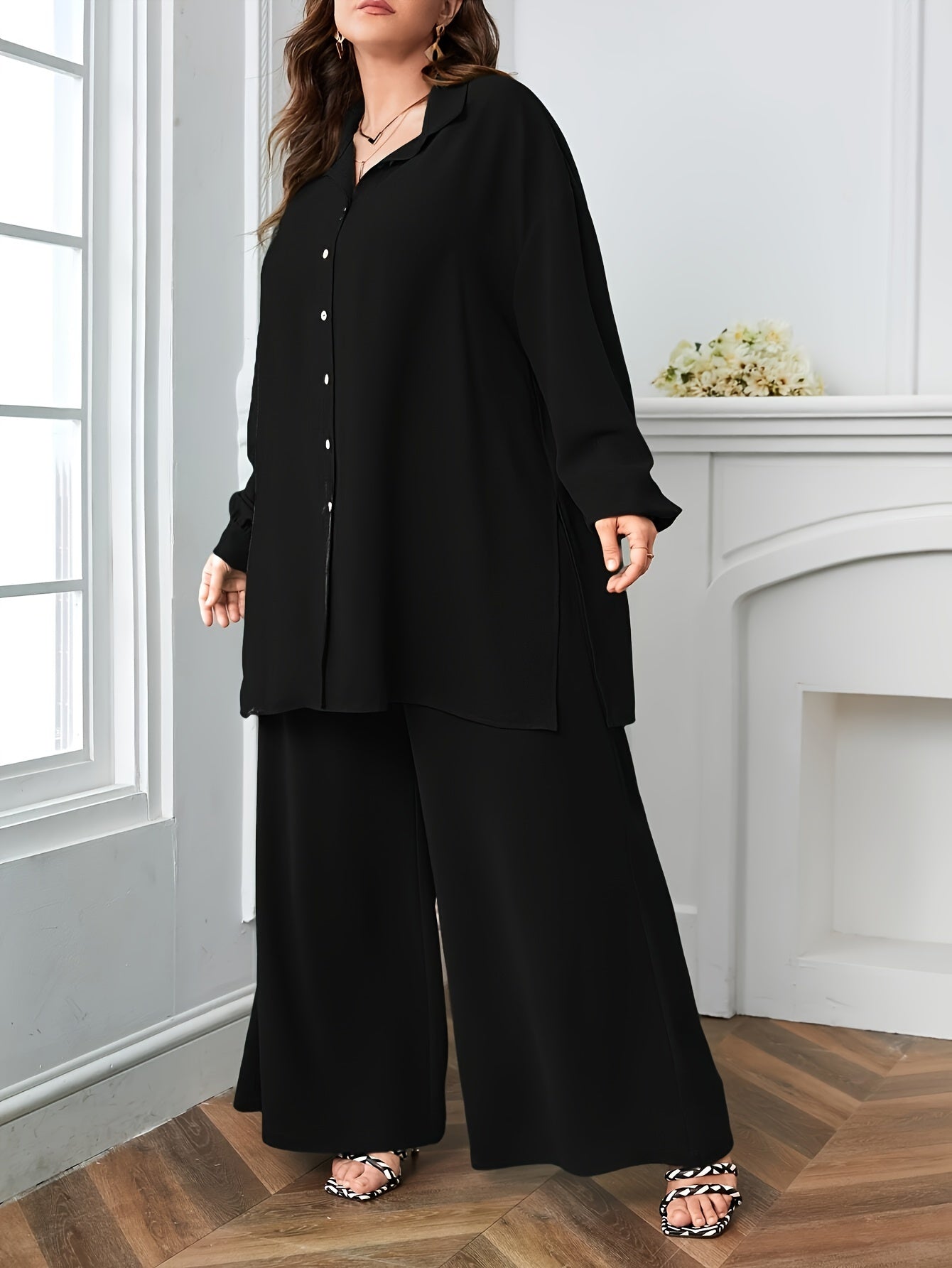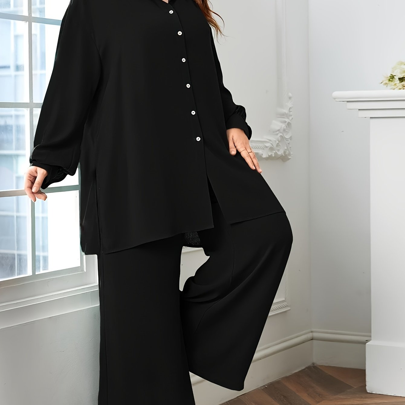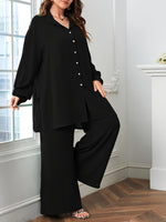 Elegant Oversized V-Neck Two-Piece Set - Black Polyester Blend Pants with Split Details and a Relaxed Blouse