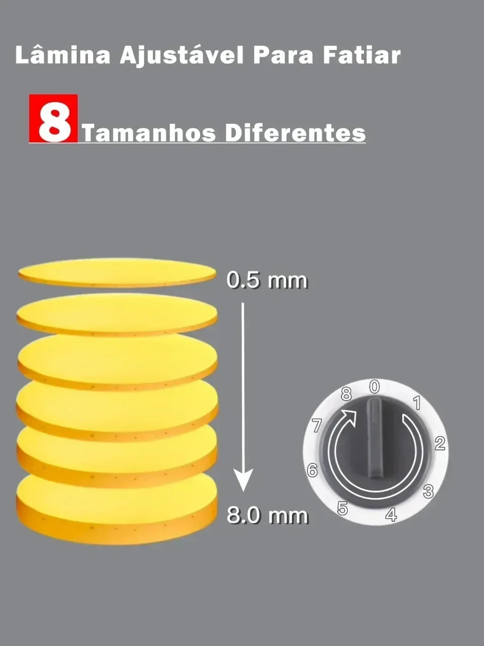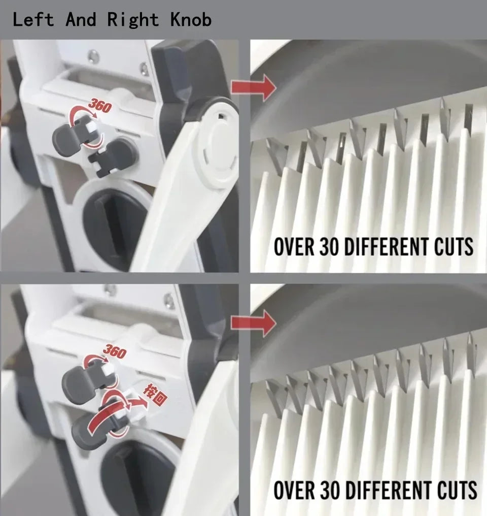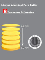 Les lames en acier inoxydable interchangeables par régulier et réglage, peuvent couper une variété de fruits et légumes en épaisseurs selon vos besoins (de 0.5 à 8mm).