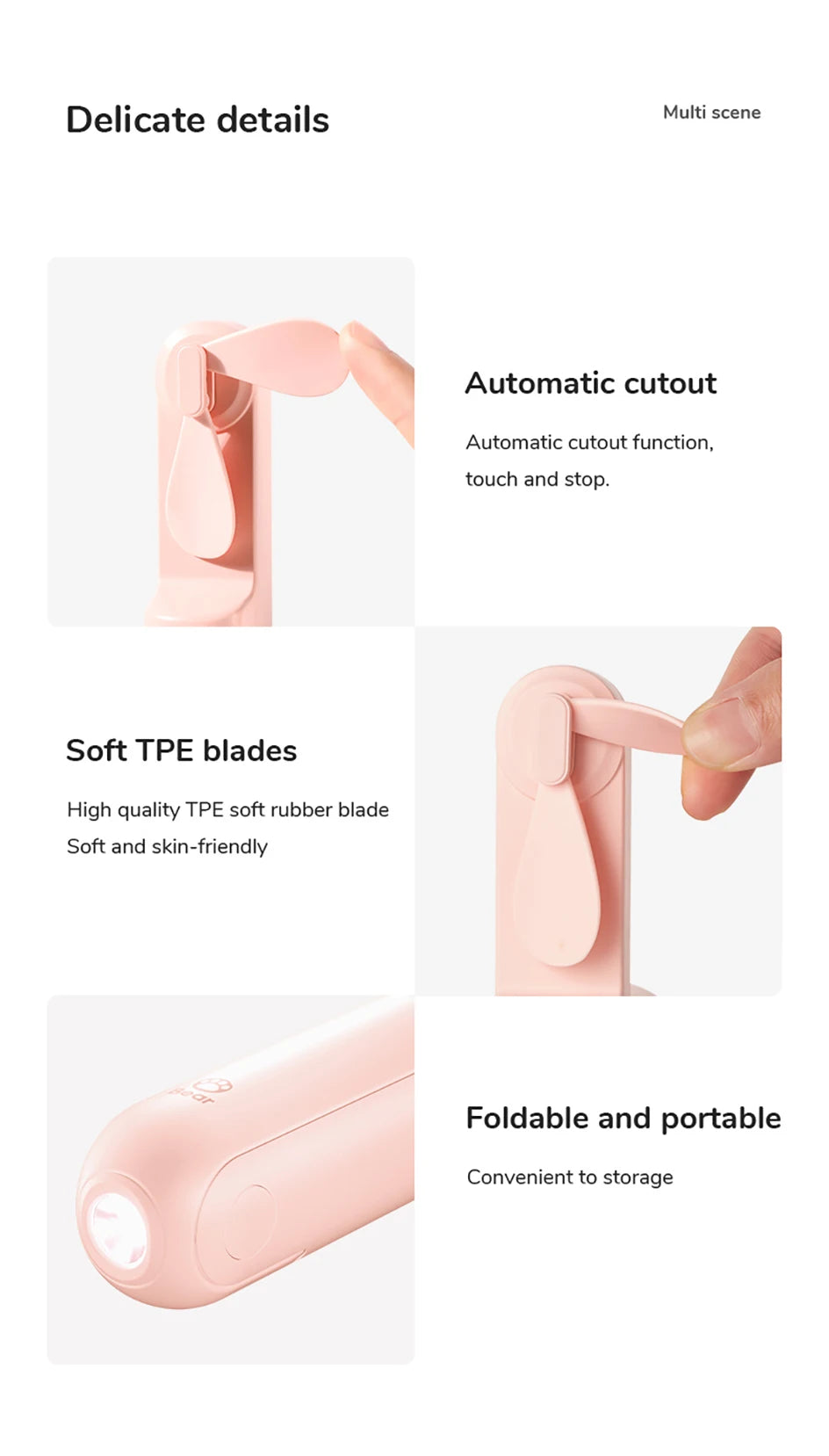 • With special soft TPE material, the blades are very safe. If you accidentally touch the rotating blades, the soft blades will automatically stop and keep you safe.