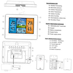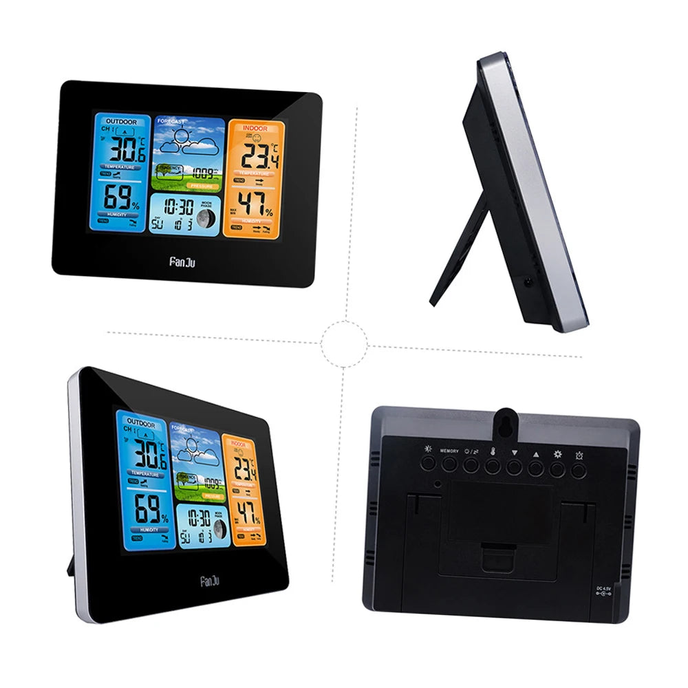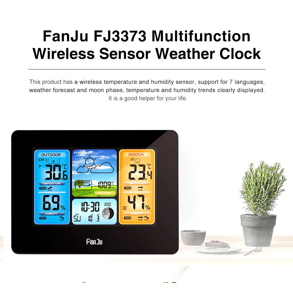 FanJu FJ3373 multifunction digital weather clock can display weather forecast, moon phase and ordinary digital clock/calendar/alarm clock function. Perpetual Calendar Up to Year 2099; Day of week in 7 languages user selectable: English, German, Italian, French, Spanish, Netherlands and Danish; Time in optional 12/24 hour format.
