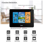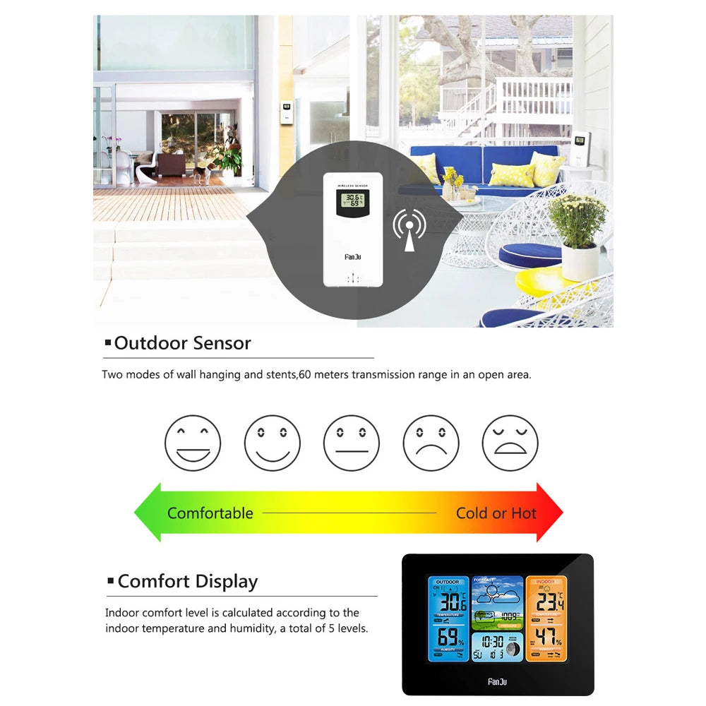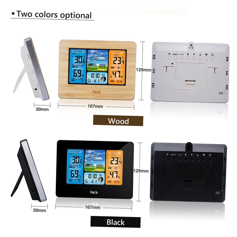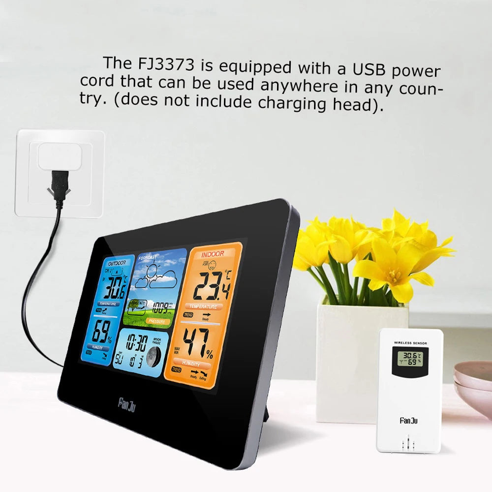 FJ3373 multi-function digital weather station alarm clock. Has thermometer, hygrometer and barometer functions, configure a wireless sensor. These data can be used to predict weather conditions in the future. It not only lets you know the time and calendar, but also helps you in your life. Suitable for a variety of locations, whether you are on the table or on the wall. Simple and modern design is a great tool and home decor.