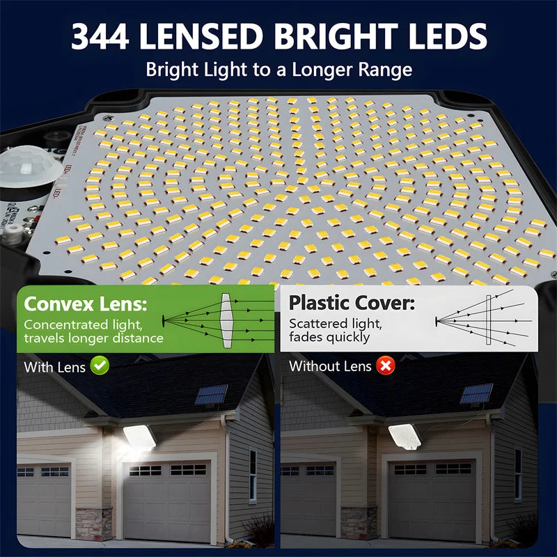 344LED solar flood lights outdoor with remote control, allowing you to choose from 3 lighting modes : ①Strong light sensor mode. —Energy-saving all night lighting option for porches, parking lots, etc.②Dim light sensor mode. —Can be used as solar security lights outdoor to scare off animals.③Dusk to dawn mode.