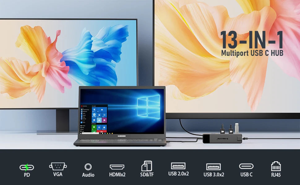 13-in-1:2*HDMI 1.4 + RJ45 1000W + 2* USB-A 3.0 + 2* USB-A 2.0 + 1*USB-C 3.0 + PD100W + SD + TF + VGA + 3.5MM